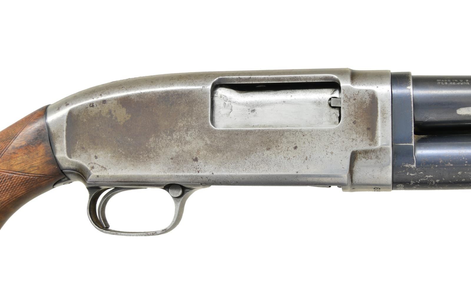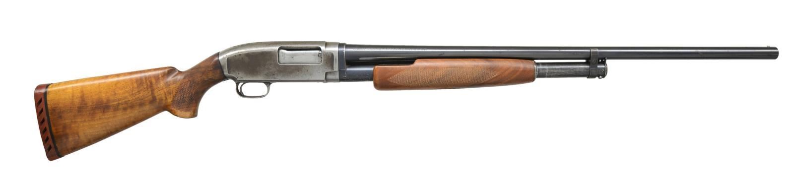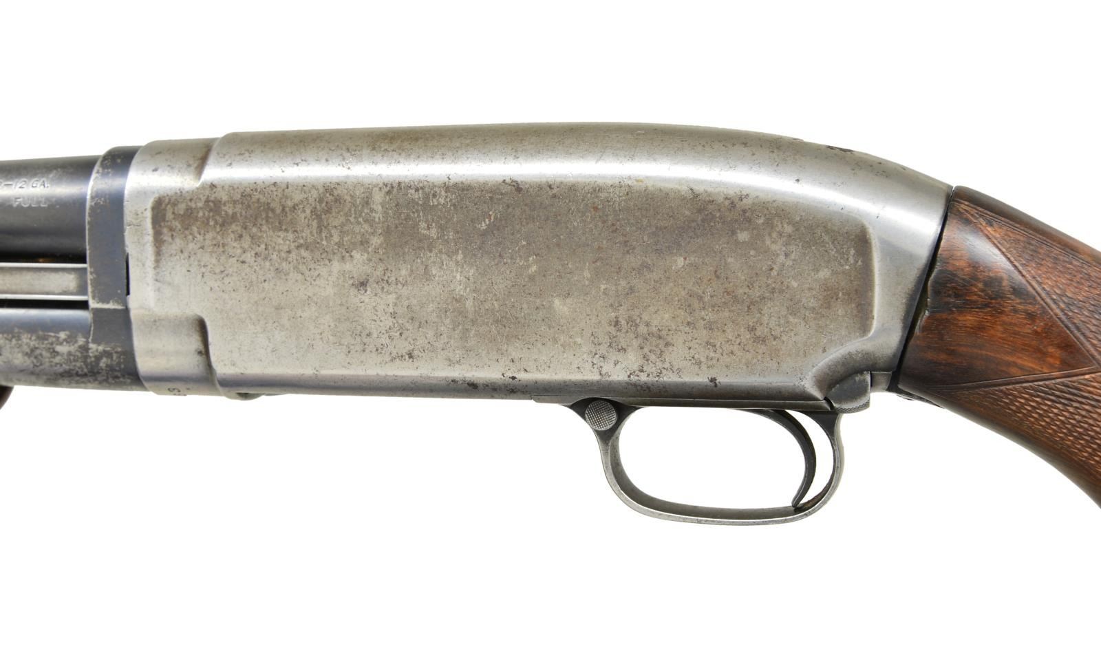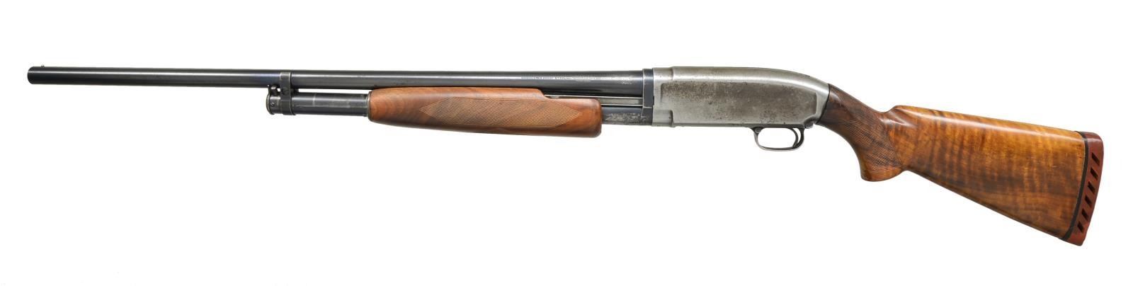 Cal. 12 Ga., 2 3/4". S# 652763. Winchester Proof Steel plain bbl. is shortened to 28" w/ cyl. bore & steel bead. Original choke marking "FULL". Aftermarket beavertail forearm w/ target style hand checkering. Uncapped pistol grip fancy walnut stock w/ hand checkering. Stock is shortened to LOP: 13 1/4" over an aftermarket Jostam pad. 1932 Mfg. CONDITION: bbl. assembly retains 80% lightly worn blue showing carry & slide wear. Action retains sm. amount of fading blue blending w/ gray appearance & scattered spots of corrosion. Forearm has good custom finish. Stock has worn finish w/ numerous scratches & marks w/ poor undersized fit at receiver & gaps at right side. Bore shows spots of fouling. (21-2073/DS). CURIO. $400-550.