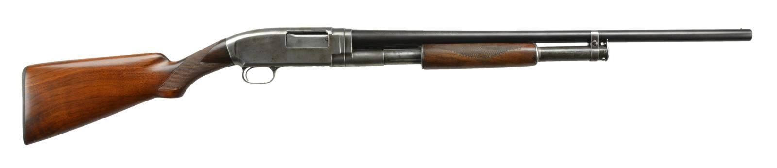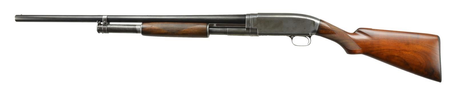 Cal. 12 Ga. S# 247391. Nickel steel bbl. has added full length matting is shortened to 26" w/ cyl. bore. Factory choke marking "MOD". Brass front bead. Sm. rnd. grooved walnut forearm w/ tournament grade checkering. Early style pistol grip walnut stock w/ added Tournament checkering. LOP: 13 5/8" over original buttplate. 1920 Mfg. CONDITION: receiver extension & mag. tube have traces of worn blue w/ balance fading to gray. Bbl. has reblued finish that is intentionally thinned to look worn & original. Bore shows spots of light pitting. Mag. takedown is difficult. Forearm has worn finish & checkering w/ handling marks. Stock has very good refinish. Bore shows spots of light pitting. Action is out of time, hammer will drop before bolt is closed, must be repaired to be safe. (21-2160/DS). CURIO. 350-550.