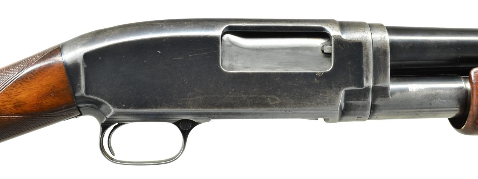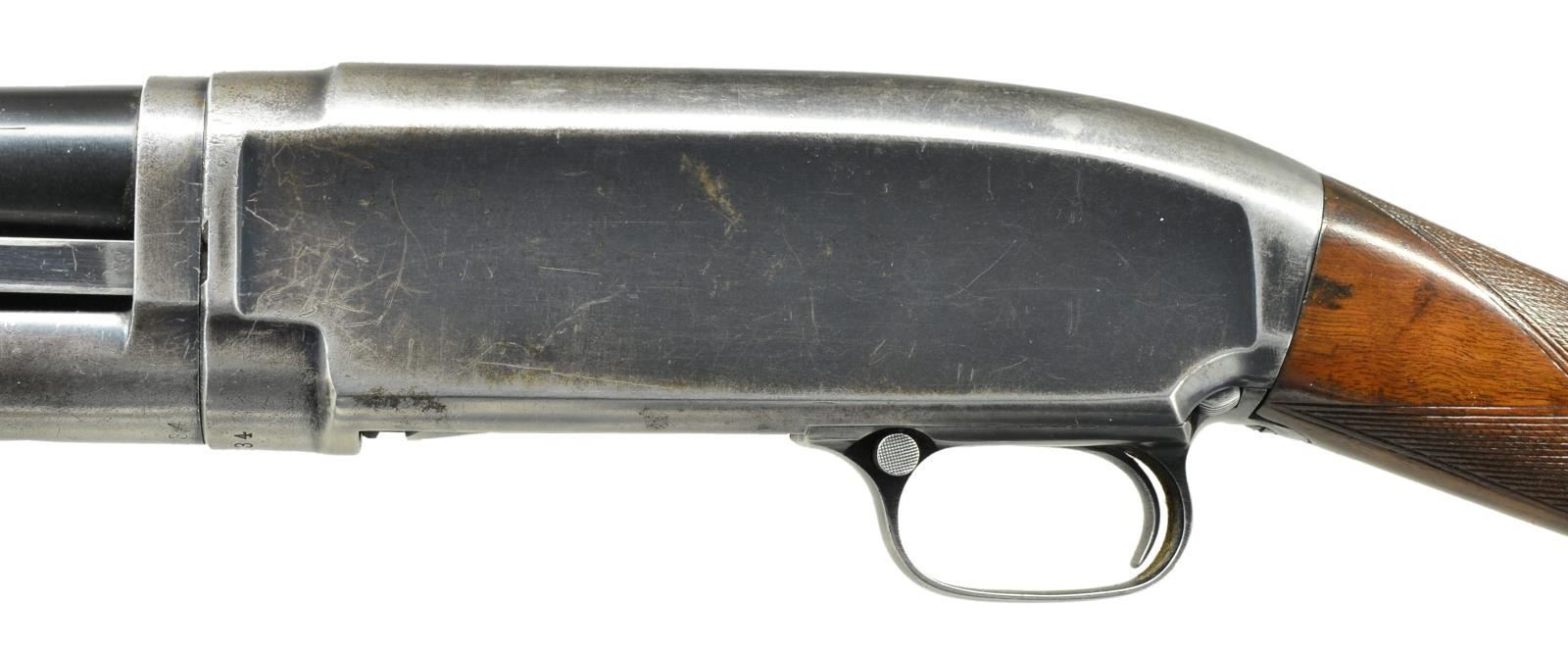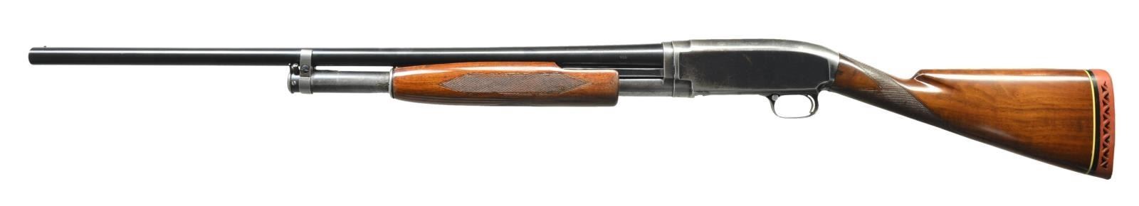 Cal. 12 Ga. 2 3/4". S# 1080334. Bbl. 28" plain w/ fixed mod choke & steel bead. Checkered walnut beavertail forearm & straight grip stock. LOP shortened to 13 3/4" over a Hawkins pad & white line spacer. Mfg. 1947. CONDITION: bbl. retains over 90% original blue. Action & mag. tube retain 70% fading blue showing carry wear, scratches & handling marks. Mag. tube has several dents. Takedown is extremely stiff. Refinished wood shows light wear w/ scratches & marks. Forearm cap is not tight on wood. Nice, bright bore. (21-2312/DS). CURIO. $400-550.