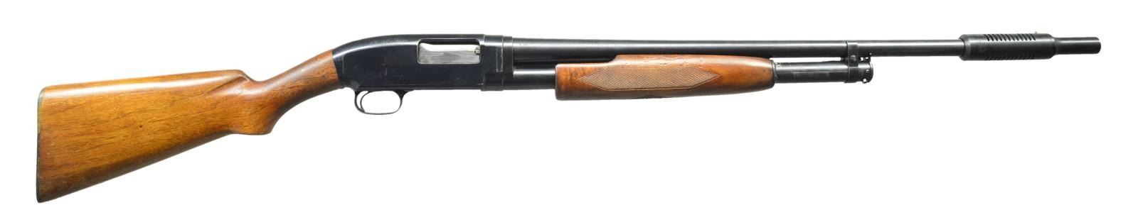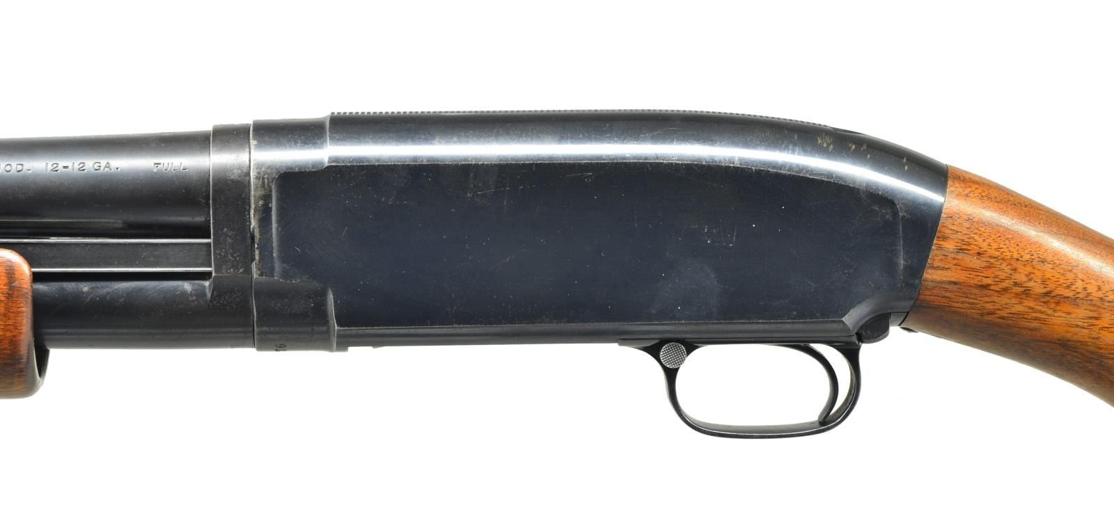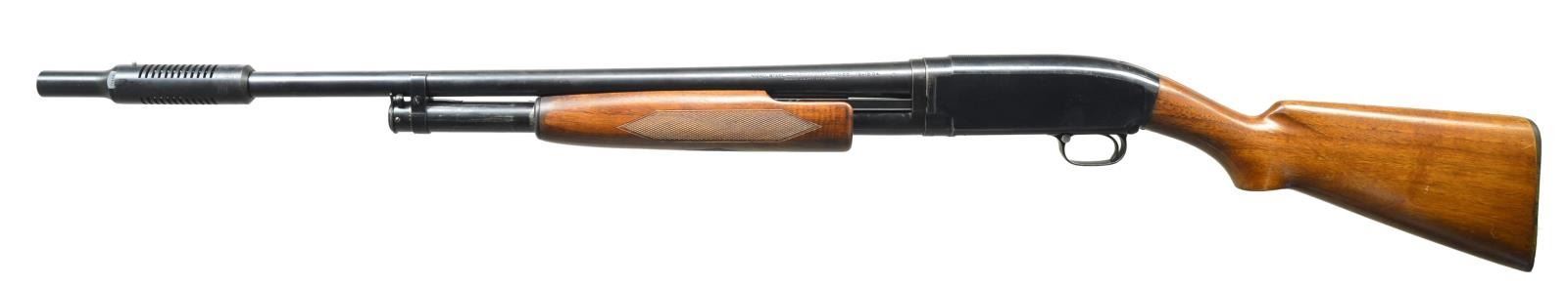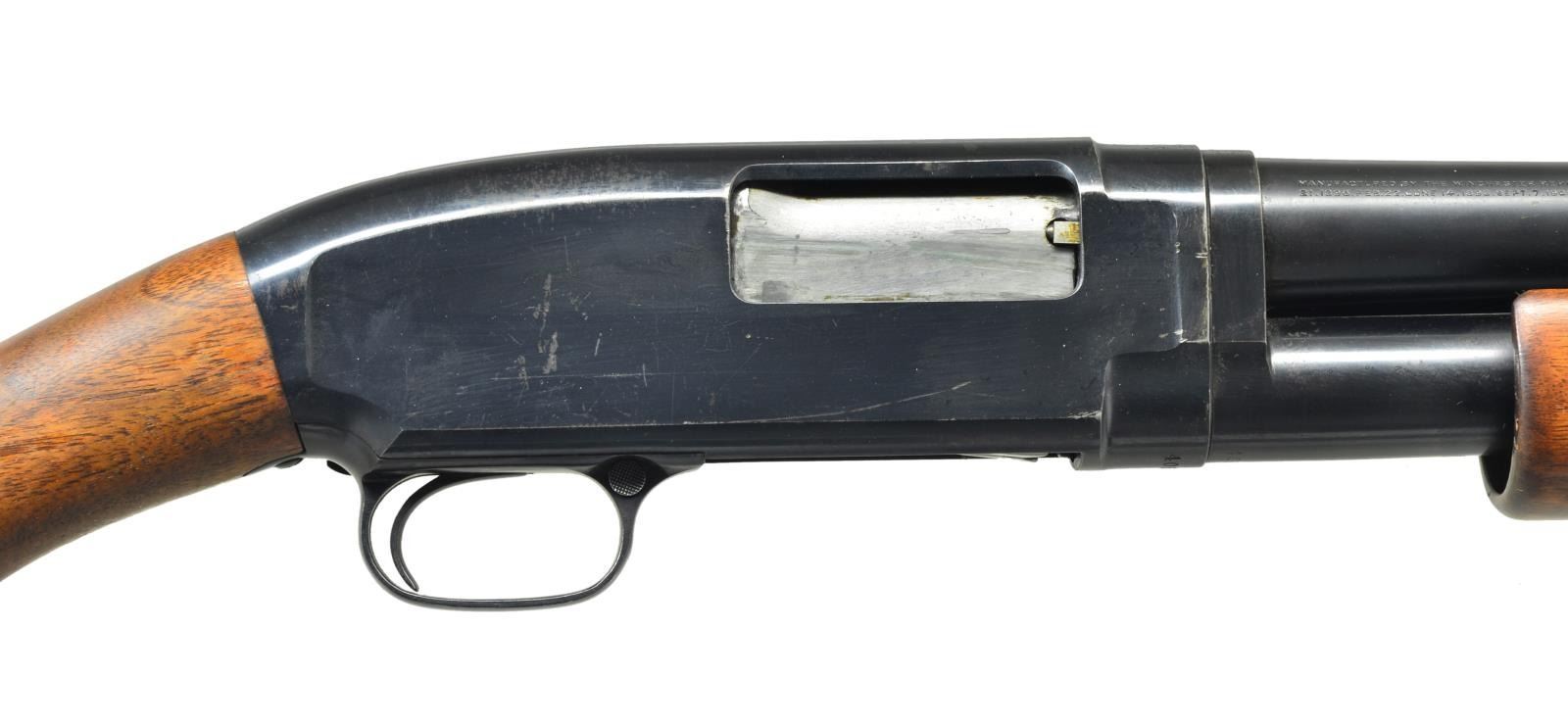 Cal. 12 Ga. 2 3/4". S# 406876. Bbl. Nickel Steel, 27 7/8" over an aftermarket Cutts compensator w/ .705 Full choke tube. Original choke marking is Full. Skeet style checkered beavertail factory forend. Early style pistol grip stock w/ original buttplate. 1925 Mfg. CONDITION: over 80% original blue showing slide & carry wear w/ scattered scratches & spots of freckling. Wood has worn original finish. Forearm shows series of dents along bbl. channel. Sound action. Bore is generally bright showing some plastic fouling forward of chamber. (22-952/DS). CURIO. $350-500.