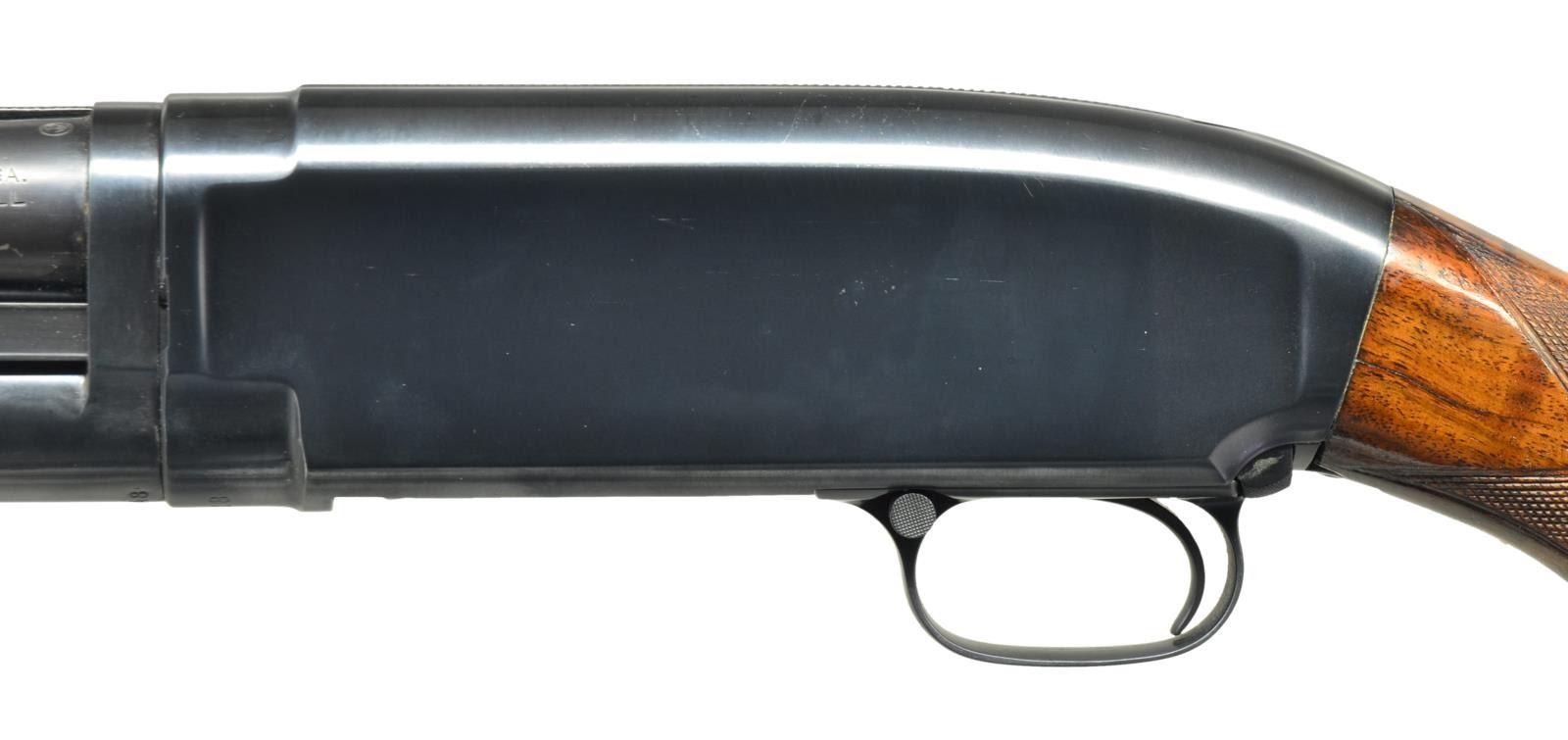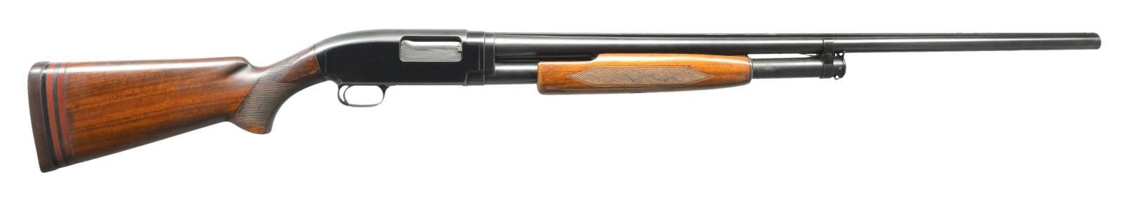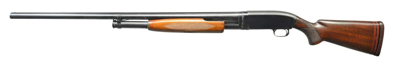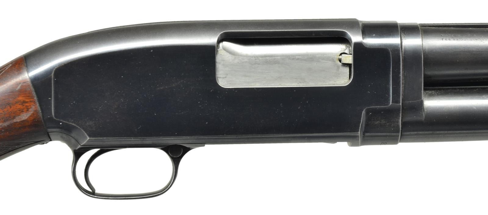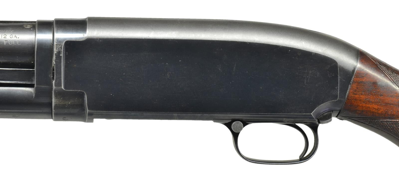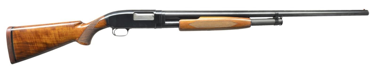 Cal. 12 Ga. 2 3/4". S# 811054. Bbl. 30" of proof steel w/ solid rib & fixed full choke. Steel front & mid beads. Receiver extension marked "MODEL-12-TRAP". Receiver marked "W" below S#. Checkered beavertail forearm & uncapped checkered walnut pistol grip trap stock. LOP is 13 1/2" over reattached solid red pad & 3/4" of alternating red & black spacers. Mfg. 1939. CONDITION: over 80% lightly faded blue showing light edge wear, sm. spots of freckling & takedown marks. Original forearm finish shows light finish in checkering w/ scattered handling marks. Sanded & refinished stock has thin checkering & handling marks. Sound action. Bore shows scattered spots of pitting, most common towards breech end. (21-2374/DS). CURIO. $600-900.