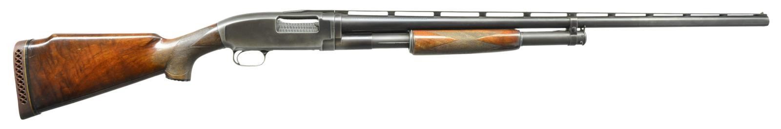 Cal. 12 Ga. S# 552879. Bbl. 30" Nickel Steel w/ factory milled VR & duckbill extension. Fixed full choke. White target front sight w/ steel mid bead. Receiver below S# marked "TRAP". Bolt has custom jeweling. Semi Beavertail aftermarket forearm w/ wrap around checkering. Aftermarket Monte Carlo pistol grip stock w/ fluted plastic grip cap & hand checkering. LOP is 13 5/8" over a poorly fit Pachmayr pad. Mfg. 1928. CONDITION: 70% lightly worn blue showing slide & carry wear. Wood has worn finish & checkering, showing dents & marks. Sound action. Bore shows some fouling. (21-2260/DS). CURIO. $400-600.
