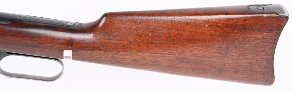SERIAL NUMBER 957166 BARREL 20 " CALIBER 32 WINCHESTER SPECIAL MANUFACTURED 1923. The Saddle ring carbine in not commonly found in the .32 Winchester Special Cartridge. Mounted with 20" round barrel, staple mounted blade front sight with elevation adjustable sporting carbine rear sight. Oil finished walnut stocks with carbine steel butt plate and fitted with saddle ring stud and ring on left side of receiver. CONDITION. Good with barrel and magazine retaining 90% blue finish Brilliant bright bore with sharp rifling. Stocks are very fine. Receiver retains 85% blue finish with losses at lower edges and balance point. Action operates properly. C&R