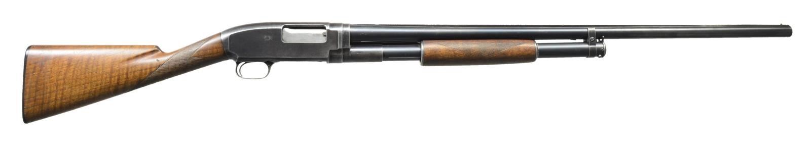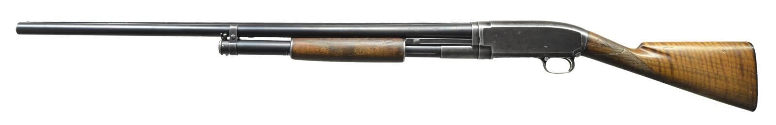 Cal. 12 Ga. S# 139040. Bbl. 30" of nickel steel w/ solid rib & brass bead. Fixed full choke. Sm. rnd. forearm & straight grip stock of nicely grain walnut w/ tournament style hand checkering. LOP is shortened to 12 3/4" w/ reinstalled buttplate. Mfg. 1917. CONDITION: sound action. Head space ring has taken up one notch. 70% fading blue showing carry wear. Refinished stocks have thinned checkering & show numerous scratches & dents. Left side of stock has sm. crack extending from receiver. Bore is generally bright, showing some plastic fouling. (21-2383/DS). CURIO. $450-700.