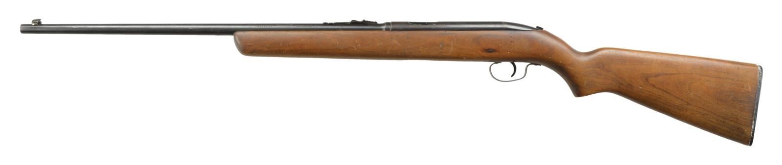 Cal. 22 S, L, LR. NSN. Bbl. 22". Mfg. 1958-1961. An interesting open bolt firing mechanism. Blued finish on exposed metal surfaces. Dovetail front sight blade & elevation adj. rear. Top loading single shot. Bottom eject 1 piece stock & forend. Checkered Winchester buttplate. Top mounted safety. CONDITION: exposed metal surfaces retain the majority of their blued finish w/ a little thinning mixed w/ a little scattered patina. Bright bore w/ strong rifling. Fire control mechanism appears to function correctly when cycled by hand. PROVENANCE: Estate Collection of Jack Verret Sr. (22-842/JZ). CURIO. $75-150.