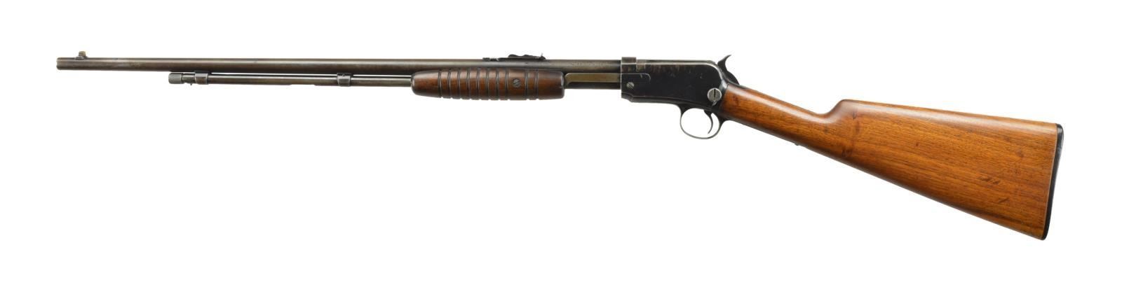 Cal. 22 S, L, LR. S# 88613A. Bbl. 23" rnd. w/ original sporting sights. Tubular magazine. Sm. rnd. grooved forearm & straight grip walnut stock w/ hard rubber buttplate. Mfg. 1939. CONDITION: 70% dull fading blue showing carry & edge wear w/ scattered scratches & marks. Forearm has lightly worn original finish. Refinished stock shows scattered scratches & marks. Bright bore retains sound rifling. PROVENANCE: from the estate collections of Charles P. Obremski. (22-1296/DS). CURIO. $300-500.