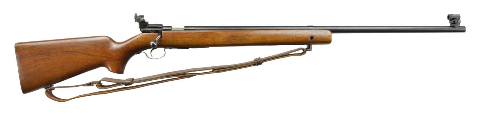 Cal. 22 LR. S# 71782. Bbl. 28" target weight. Redfield globe front sight w/ Redfield receiver target sight. Bbl. is drilled for scope blocks. Walnut target stock w/ checkered steel buttplate. Leather military style sling on original swivels. Mfg. 1950. MAGS: 3 - 5 rd. replacements w/ floorplates marked "W" & 1 single shot adapter. UNATTACHED ACCESSORIES: "Lee Shaver's Globe Sight Insert Set". CONDITION: 98% blue. Original stock finish shows scattered scratches, marks & sm. dents. Bright near excellent bore. PROVENANCE: from the estate collections of Charles P. Obremski. (22-1297/DS). CURIO. $350-550.