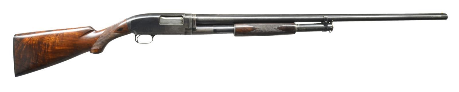 SHOTGUN. Cal. 12 Ga., 2 3/4". S# M88456 (1974-1981). Bbl. 30" w/ wide VR having white target front bead & brass mid bead. Imp. Mod. Trap choke. Blue finish. Right side of receiver is fitted w/ Brichwood Casey shell catcher. Gold trigger. Checkered walnut forearm & Trap dimension pistol grip stock w/ Win. metal grip cap & Win. black ventilated recoil pad. CONDITION: Very good overall appearance w/ light marks & 1 spot of light pitting. Forearm has area of scratches. Buttstock has series of gouges along toeline. Very good shiny bore. Breech bolt appears to occasionally freeze when in battery, needs gunsmith attention. (22-2194/MD). MODERN. $400-600.