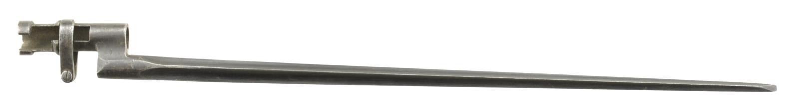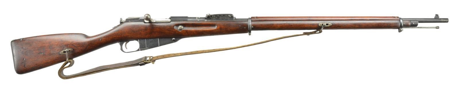 RIFLE. Cal. 7.62x54R. S# 99423 (1896). Bbl. 31.5" w/ stepped blade front sight. Tangent ladder rear sight remarked from archins to meters. Bbl. has "SA" Army marking. Hex receiver w/ Russian Imperial eagle proof. Matching numbered bolt. Hardwood stock set w/ S# "80149" on left side. Older style stock made for finger groove trigger guard inlet filled. Finnish marked Italian style brown leather sling on sling swivels in sling slots. UNATTACHED ACCESSORIES: Tula marked socket bayonet numbered 53031. Fair overall condition w/ marks & wear. CONDITION: good overall as arsenal refinished w/ wear & moderate marks Metal has prior pitting & oxidation. Good bore w/ strong rifling & light pitting. (01-21005/MD). ANTIQUE. $300-400.