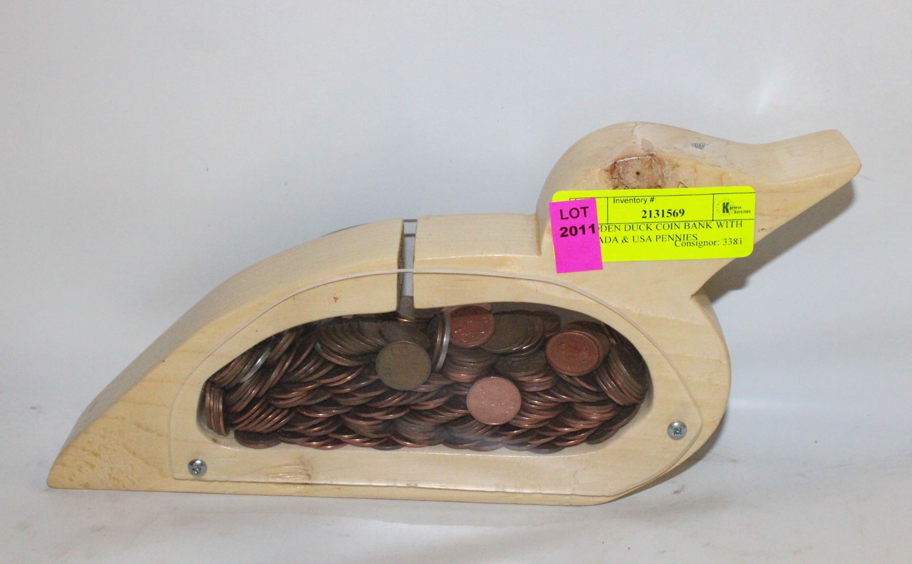 WOODEN DUCK COIN BANK WITH CANADA & USA PENNIES