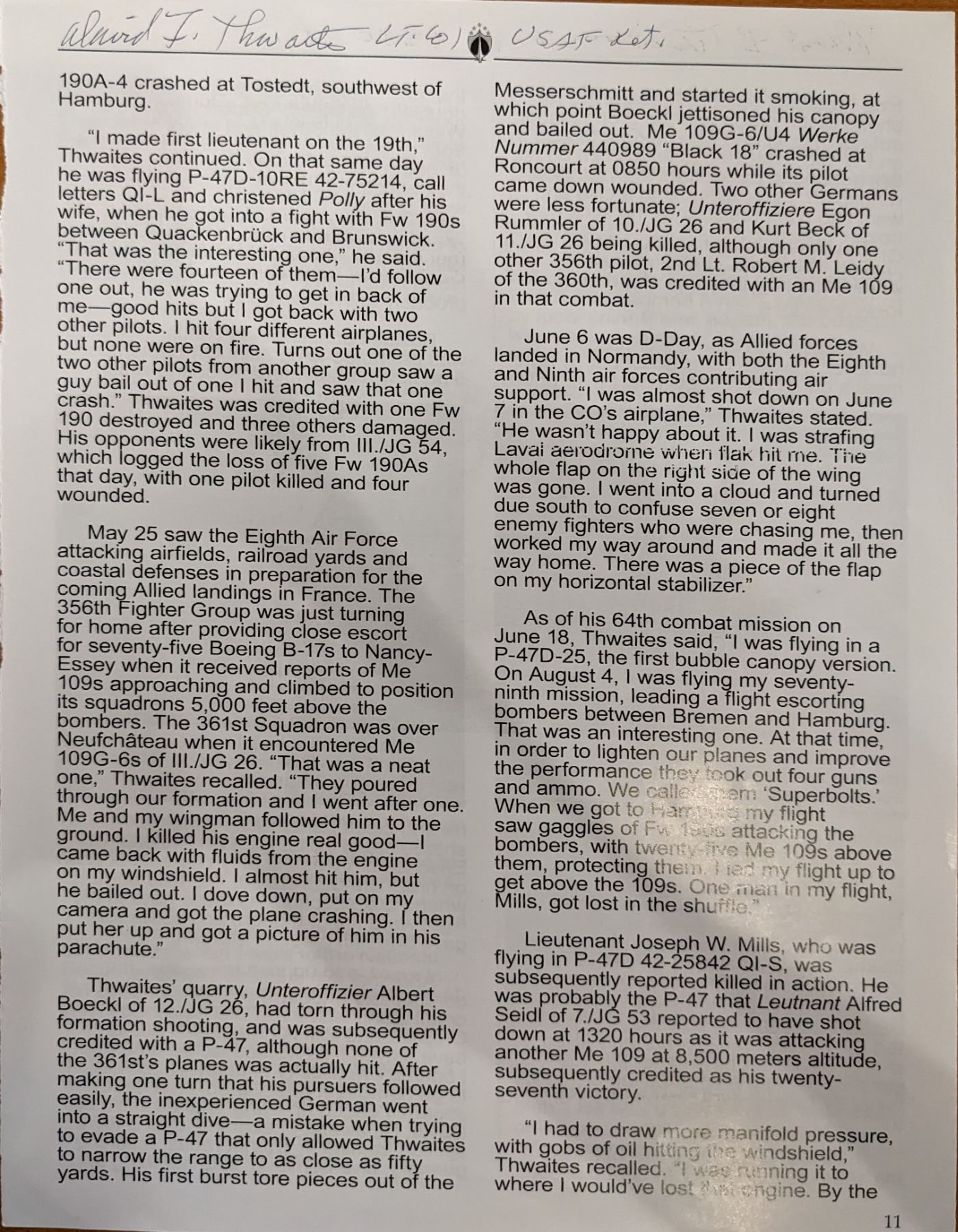 WW2 ACE David Thwaites Signed Bio Page. 9x11 inches