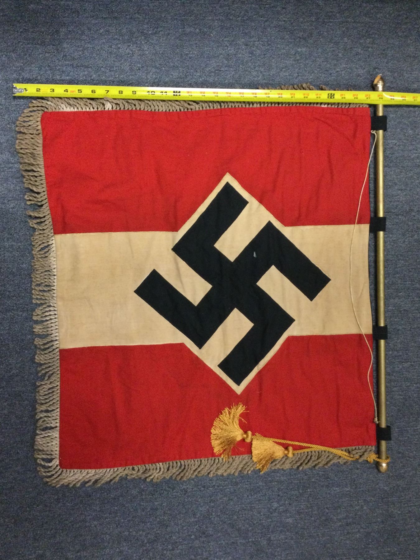 You are bidding on a highly unusual and rare flag, this flag on one side displays the Nazi Youth Flag, then upon graduation the SS Flag is reversed and hung from the podium, a fantastic addition to your collection