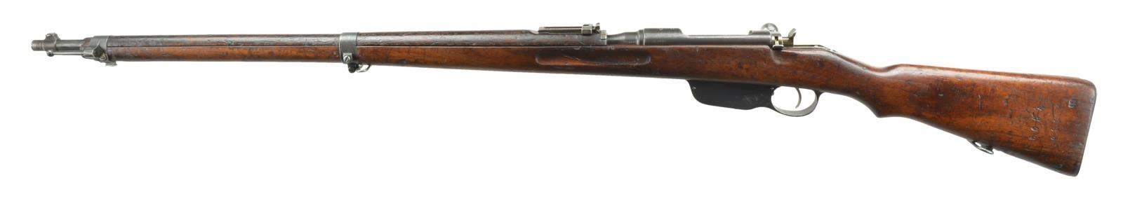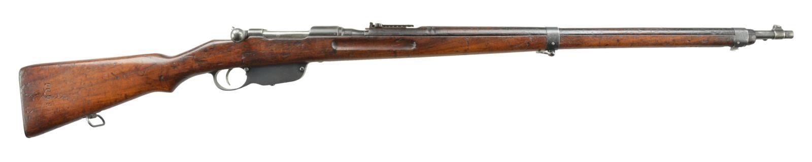 RIFLE WITH CZECH MARKINGS. Cal. 8x50R. S# 5659E. Bbl. 30.5" w/ band mounted blade front sight & 2600 shritt ladder rear sight. Matching numbered bbl,. bolt & 2 piece walnut stock. Left side of buttstock has 2 previous S#'s crossed out w/ "S" & Czech lion proof. Buttplate has Austrian regimental marking " 56 R / 331". UNATTACHED ACCESSORIES: wooden muzzle cover. CONDITION: good overall arsenal refinished w/ worn condition commensurate w/ age. Metal fading to gray w/ peppery oxidation & patina. Receiver ring markings have partially white highlight filler. Stock has deep gouges w/ long scratches that appear like cracks. Fair pitted worn bore. (22-626/MD). CURIO. $300-500.
