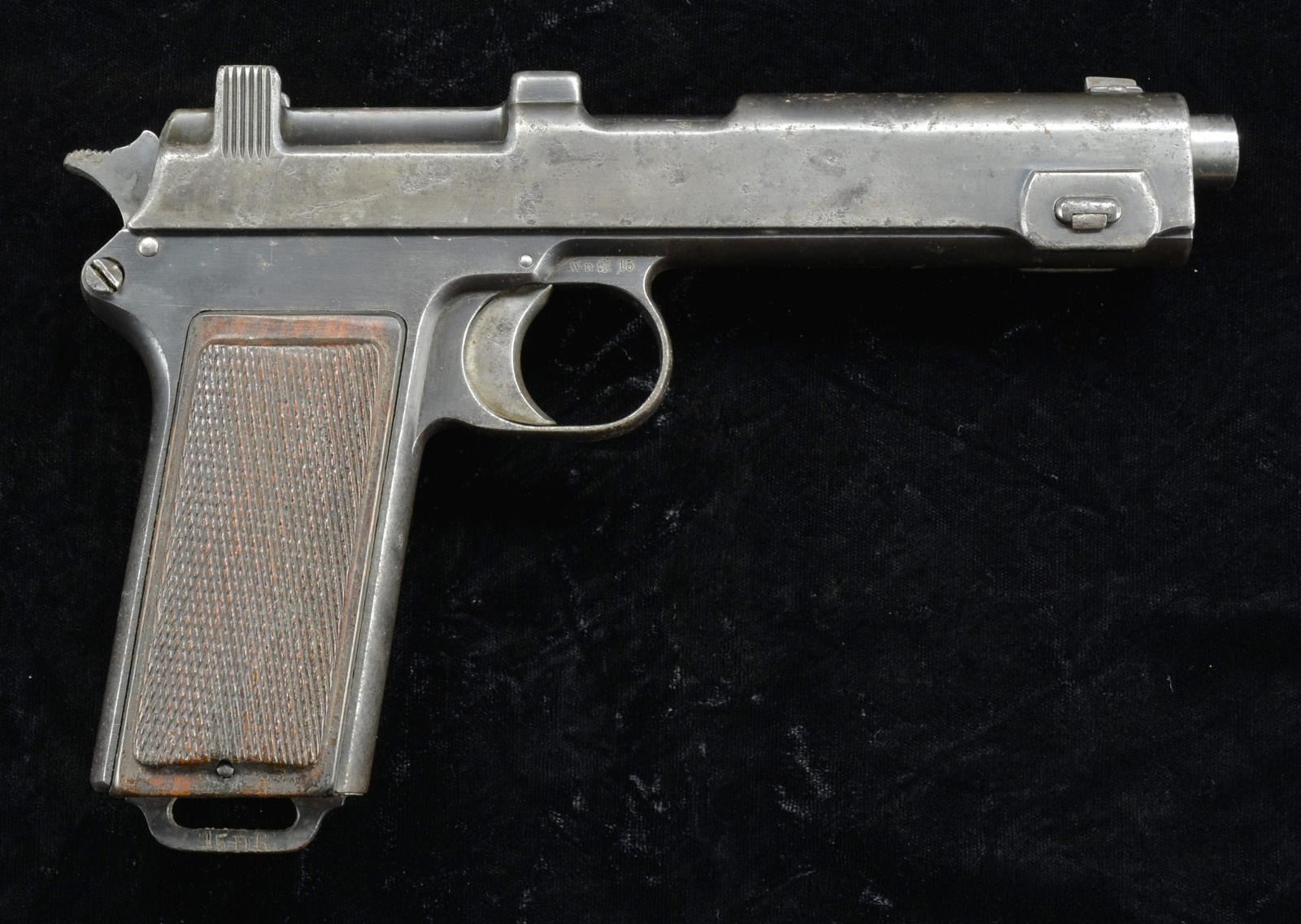 PISTOL. Cal. 9mm Steyr. S# 9930g (1915). Standard issue pistol for Austria-Hungary during WWI w/ matching number 5" bbl., slide & frame. Butt of frame has lanyard ring at butt w/ mark "15DR". Internal 8 rd. mag. fed by stripper clip. CONDITION: fair overall as arsenal refinished w/ blue fading to gray/brown patina over prior pitting, peppery oxidation & marks. Good grips w/ marks at bottom. Very good bore. (22-2044/MD). CURIO. $300-450.