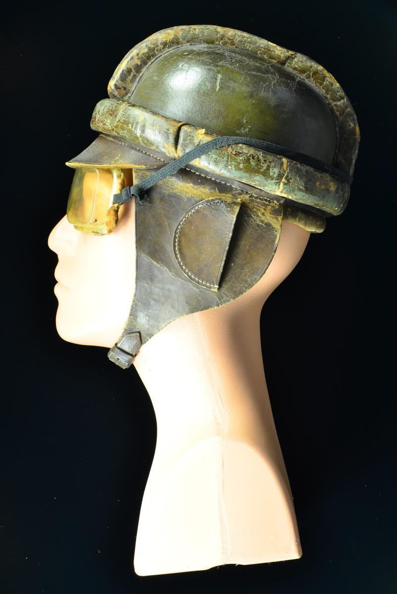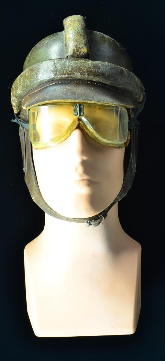 HELMET. Length: 9". Height: 7". Helmet of brown leather w/ additional padding on crown & rim. Leather chin straps. 9 Leather ear flaps on interior as the liner. Leather neck guard has partially obscured maker's stamp " g. Bekl / Doberitz / 1918". Also included are German WWII style goggles connected by hinge w/ fur lining, & cord straps. CONDITION: fair intact condition w/ numerous scrapes, & cracking on leather on exterior. liner, chine straps & neck guard intact w/ tight stitching, scuffing, flexing & staining. (02-16350/MD). $400-600.
