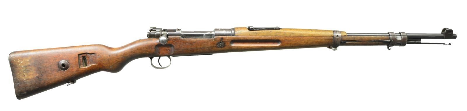 RIFLE ARSENAL MODIFIED TO SHORT RIFLE CONFIGURATION. Cal. 8mm Mauser. S# 344 RR. Bbl. 23 3/4". This rifle which was produced at the Erfurt Arsenal in Germany as a KAR 98 has been converted to resemble Spanish Model 43 Mauser features. Workmanship does not appear to be the high standards of a German arsenal. Sm. ring receiver is marked on top w/ Imperial German crown, "ERFURT" "1916". Marked on right side w/ Imperial proofs & marked on left side w/ Prussian eagle proof. Bolt handle appears to be straightened from original turned down style. Tangent rear sight graduated to 2,000 meters. Inverted V front sight w/ protective hood. Muzzle cover retaining tab has been removed. Rifle has been given a "Gew 98" type upper band w/ parade hook & bayonet bar. 12 1/2" cleaning rod. Original type lower band w/ bottom swivel; both bands are now retained by separate springs w/ filled area between band springs. Walnut stock set w/ hand guard has been shortened to approx. 3/4" beyond lower band. Buttstock w/ grasping grooves has original sling swivel mortice filled. Stock has added swivel at belly. Flat buttplate. Steel disassembly hole. Machined mortice for German type sling. CONDITION: stock set has wear, staining & handling marks throughout. Stock has approx. 3" crack on left side below receiver rail & two 2" cracks on the right side behind the recoil bolt. Metal has traces of blue turning overall gray w/ scattered areas of light oxidation & wear. Bore has worn lens & frosted appearance in grooves. (22-655/RW). CURIO. $300-500.