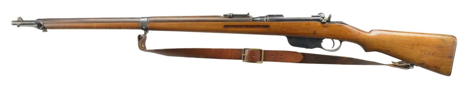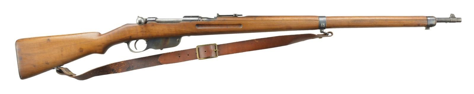 STRAIGHT PULL RIFLE. Cal. 8x50R. S# 9639Z (1916). Bbl. 30.5" w/ band mounted blade front sight & 2600 shritt ladder rear sight. Bbl. shank has "E" above S#. Matching numbered bbl, & 2 piece walnut stock. CONDITION: fair overall as refinished. Metal parts have been refinished over prior pitting w/ evidence of heat treatment giving off case colors. Sanded & refinished wood has handling marks & sm. cracks. Good bore w/ strong rifling. (22-616/MD). CURIO. $150-250.