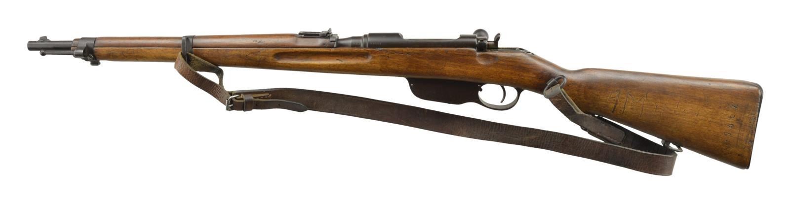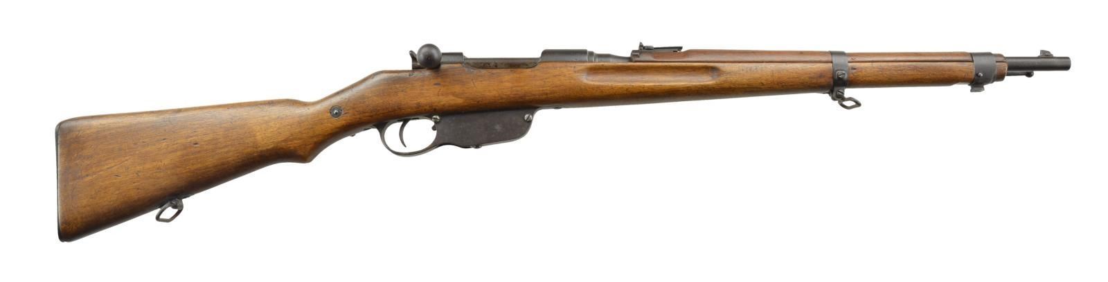 MANNLICHER STRAIGHT PULL CAVALRY CARBINE Cal. 8x50R. S# 9746Z (1917). Bbl. 19.5" w/ blade front sight & 2600 Shritt ladder rear sight. Matching numbered bbl. & Repetier-Karabinerstutzen configuration 2 piece stock. Stock has brown leather sling & bored soldier "9Mm" carved on left side buttstock. Buttplate has partially visible regimental marking "18R / 11332" CONDITION: Good overall as arsenal refinished. w/ moderate marks Metal has a dark brown patina appearance w/ partially obscured markings. Stock has worn finish. Fair sling w/ cracking finish. Good bore w/ light pitting. (22-623/MD). CURIO. $300-500.