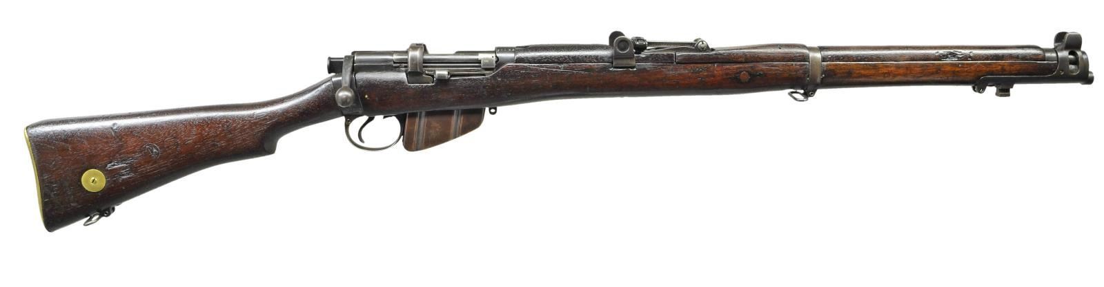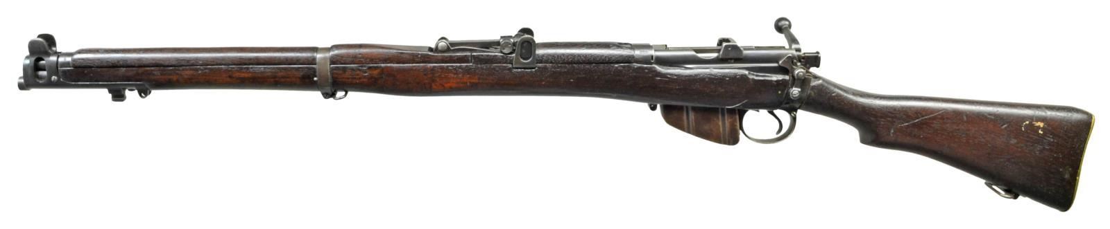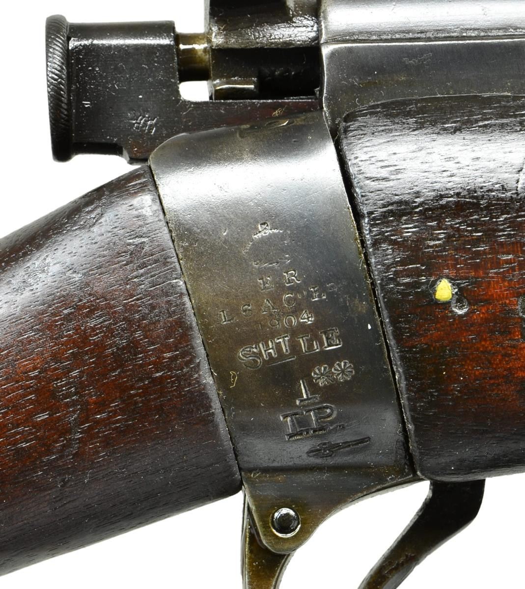 ACTION MILITARY RIFLE. Cal. 303 Brit. S# 90183. Bbl. 25". All visible numbers match. Butt socket marked on right side w/ royal crown "ER" "LSA CO. LD" "1904" "SHT. LE" "1" "two stars" "I.P.". Marked on left side w/ "RFI" "broad arrow" "1915". Action fitted w/ mag. cut off. Tangent rear sight w/ windage adjustment graduated to 2,000 yards. Bbl. marked underneath sight w/ "IS" & "HV". Blade front sight. Nosecap has protective ears. Bayonet mt. & provision for stacking swivel. Hardwood stock set. Buttstock w/ brass trap buttplate has circular "?SA" w/ broad arrow marking on right side & unmarked brass disk. MAGS: 1 detachable 10 rd. CONDITION: stock set has moderate wear, staining & handling marks throughout w/ appearance of added finish. Metal has worn thinning arsenal rework finish. Fair bore; shiny but w/ worn lands. (22-580/RW). CURIO. $300-500.