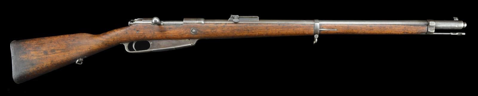 COMMISSION BOLT ACTION RIFLE. Cal. 8mm Mauser. S# 796f. The Ottoman Empire was given GEW 88/05 rifles from the German Empire during WWI. This rifle appears to have 88/05 conversion as evident by notch on receiver ring, rear bridge having stripper clip guide, added metal tab inside mag. to retain cartridges & sheet metal cover for bottom port of mag. When the Ottoman Empire accepted these rifles, a "crescent moon" was stamped on the receiver ring & the ladder rear sight was remarked in Farsi. Bbl. 29" w/ jacket having blade front sight. Matching numbers on rear sight ladder, bbl. (previous S# crossed out), & bolt (in Farsi). Full length walnut stock w/ sling swivels, cleaning rod & buttplate. CONDITION: fair as arsenal refinished. Gray/brown metal patina w/ dents on bbl. jacket, moderate marks, pitting & oxidation. Worn wood finish w/ moderate marks. Poor worn bore. (01-20675/MD). ANTIQUE. $150-300.