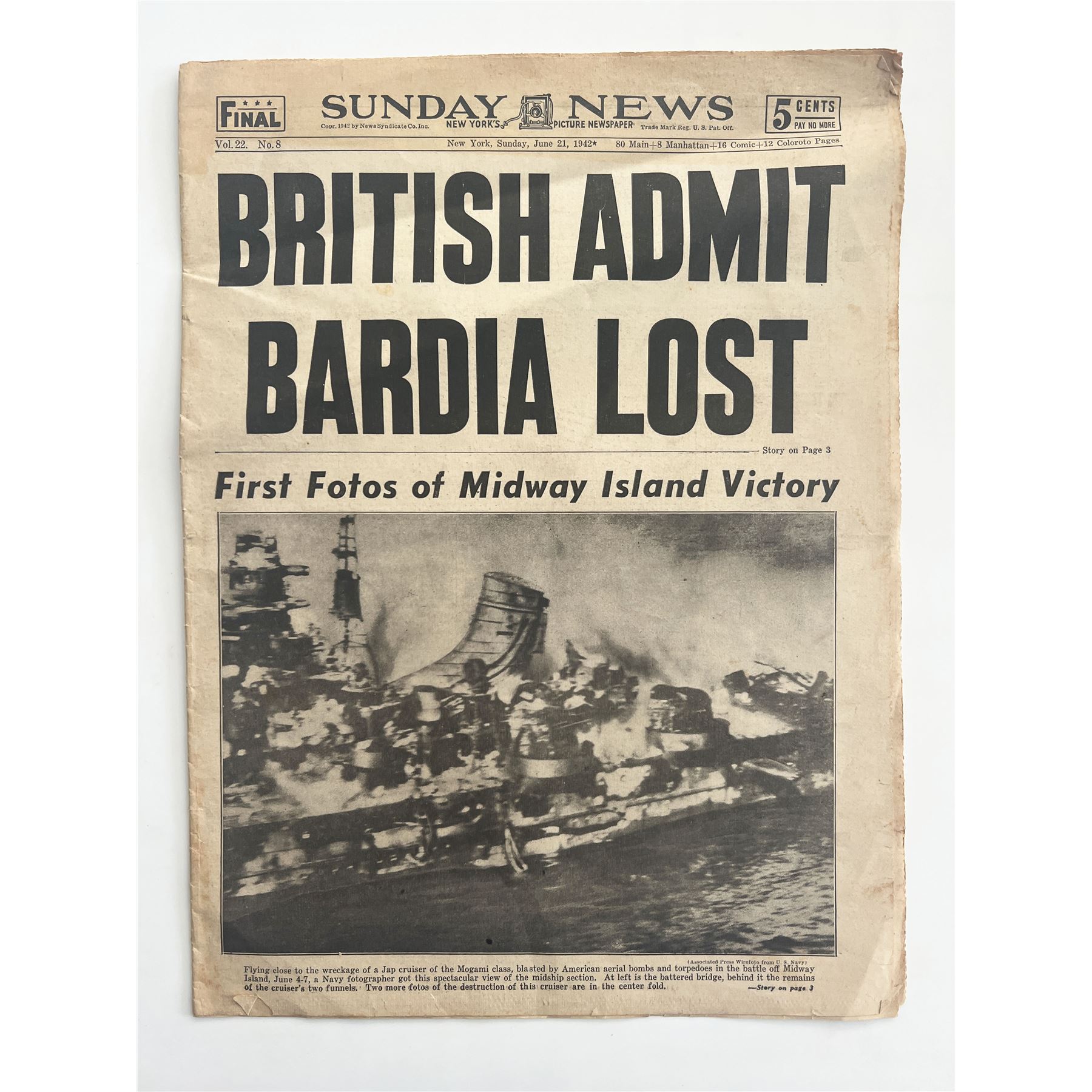 WWII 1942 Sunday News newspaper - New York, Sunday June 21st 1942 - British Admit Bardia Lost. 12x15 inches
