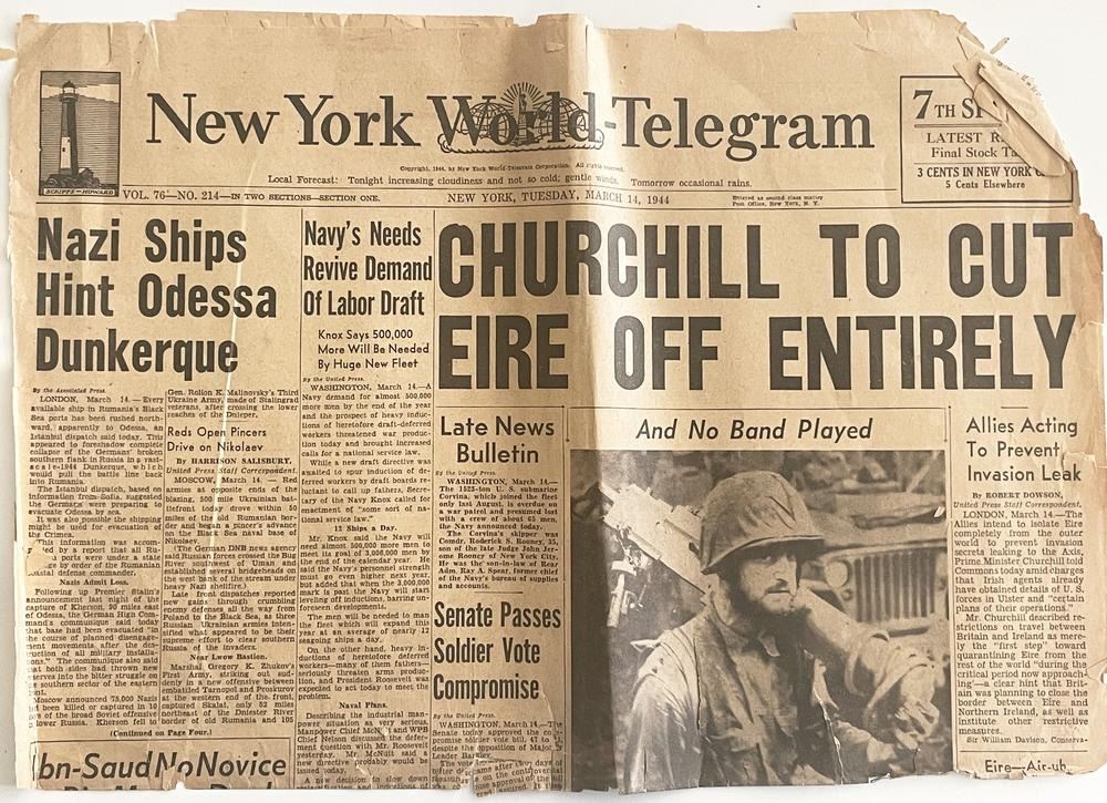WWII New York World Telegram Original Vintage Newspaper - Churchill to Cut of Eire Entirely - March 14th, 1944