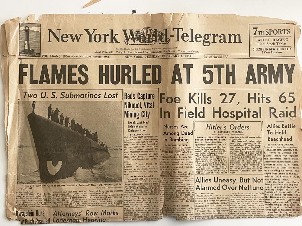 WWII 1944 New York World Telegram Original Vintage Newspaper - Flames Hurled At Fifth Army - Tuesday February 8th, 1944. 16x22 inches