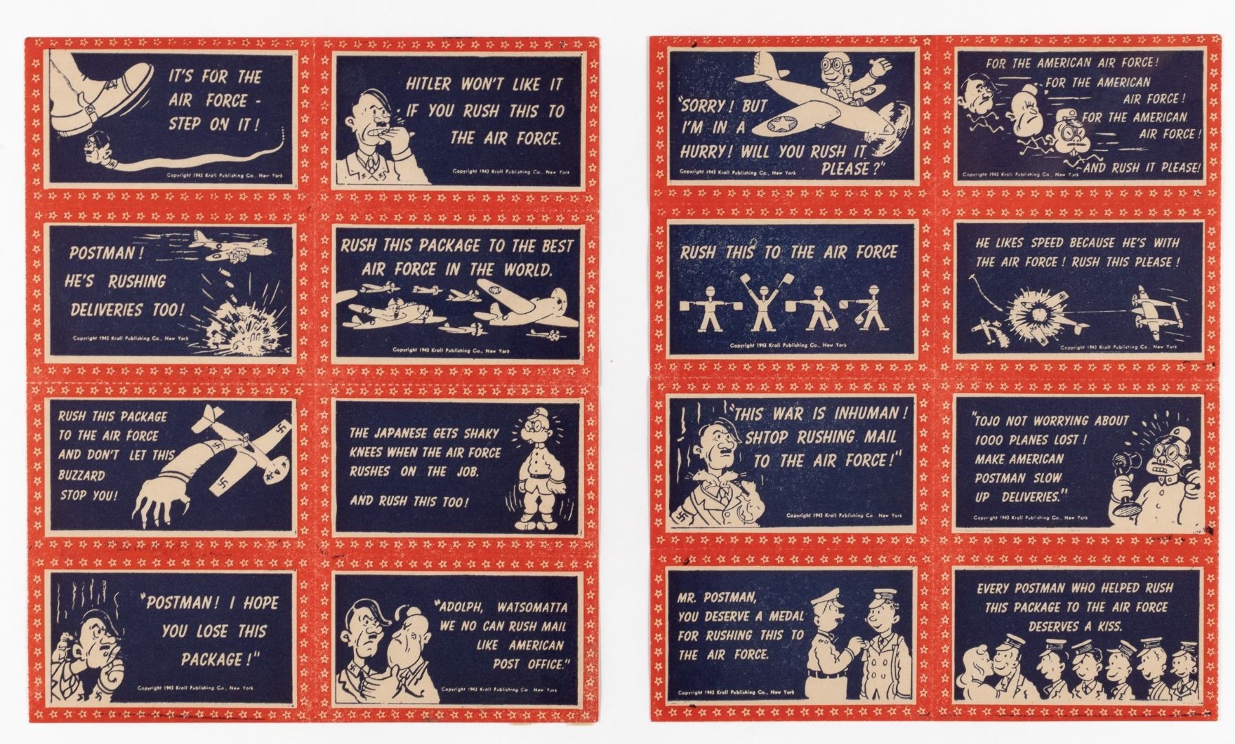 Lot of sixteen American vignettes and anti-axis propaganda stamps, 1943 Kroll Publishing Co, New York. Each sheet is 6 x 5 inches.