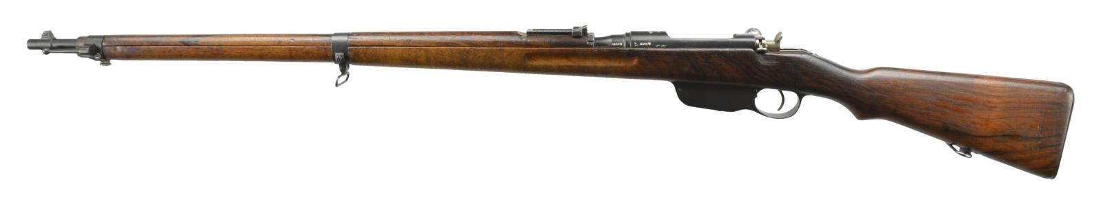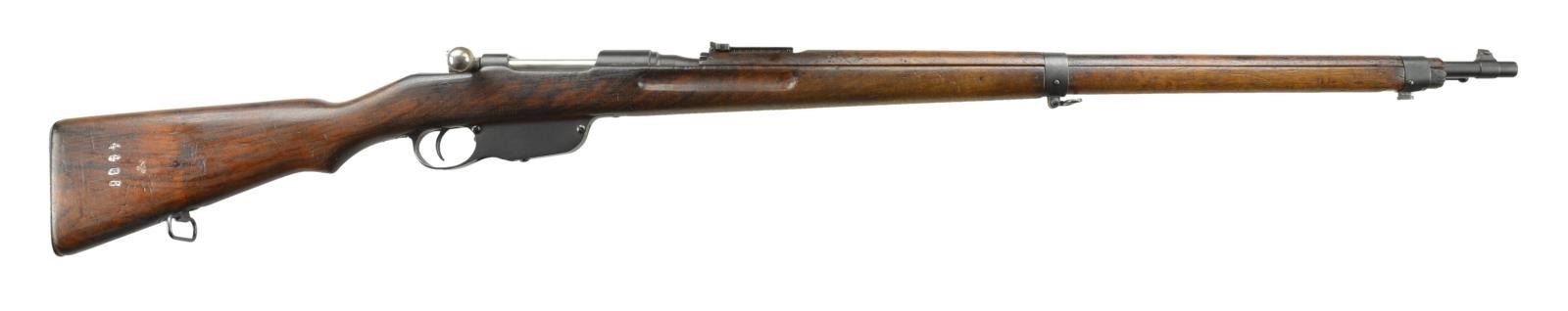 PULL RIFLE WITH GERMAN EAGLE PROOFS. Cal.8x56R. S# 4466W. Bbl. 30 1/2" w/ band mounted blade front sight & 2600 shritt ladder rear sight. Matching numbered bolt & bbl.; shank has "S" obscuring date proof indicating ability to shoot spitzer cartridges. Receiver ring, bbl., & 2 piece stock set have German eagle acceptance proofs & Eagle "63" proofs. Left side of buttstock has crossed out number, right side of buttstock has stamped matching S# over previous number. CONDITION: very good overall appearance as arsenal refinished w/ moderate handling marks. Markings on receiver have been enhanced w/ white paint. Fair bore w/ worn lands. (22-742/MD). CURIO. $200-400.
