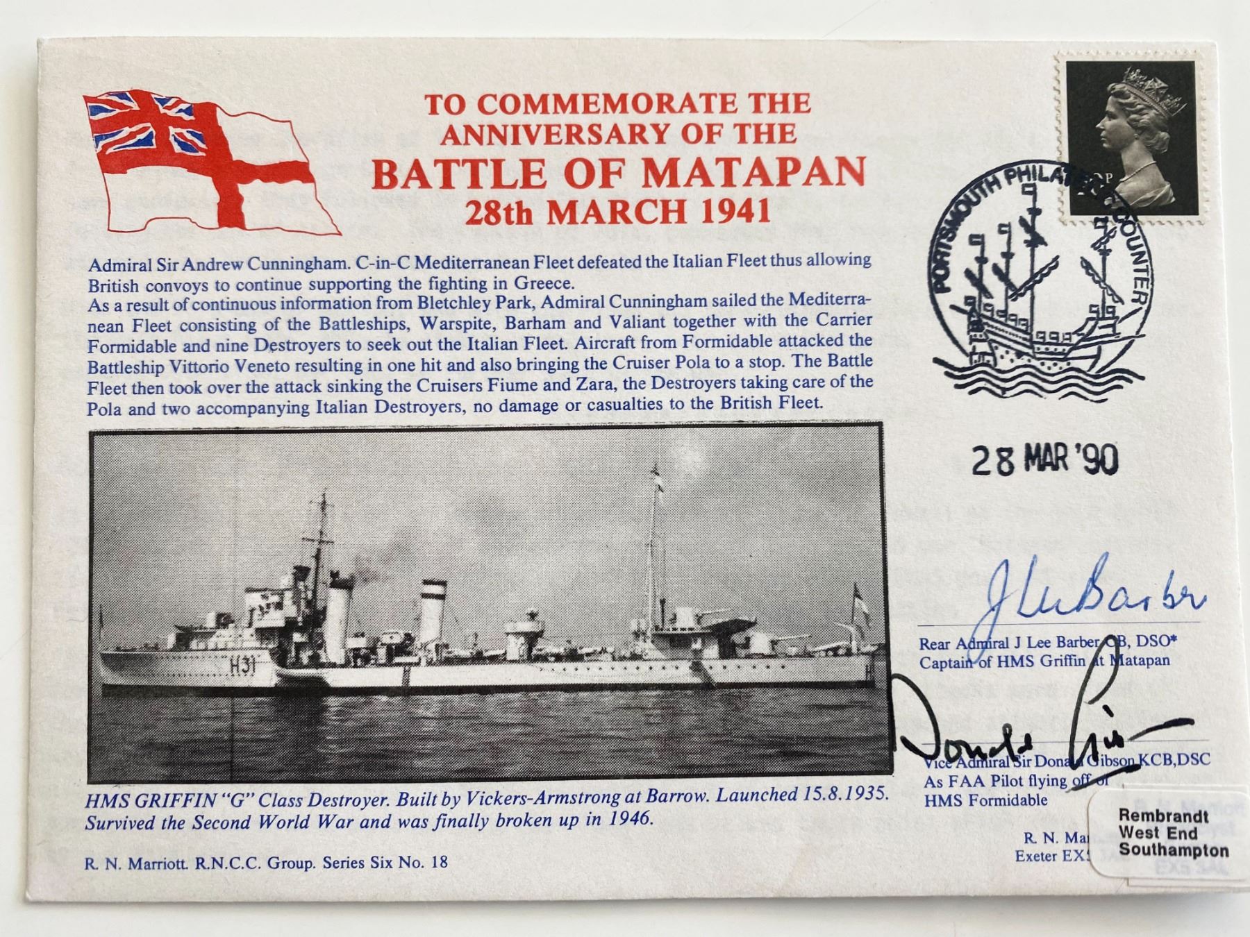 WWII Anniversary of Battle of Cape Matapan Commemorative Signed Cover Autographed by Rear Admiral J Lee Barber and Vice Admiral Sir Donald Gibson - 28th March 1990. 5x7 inches
