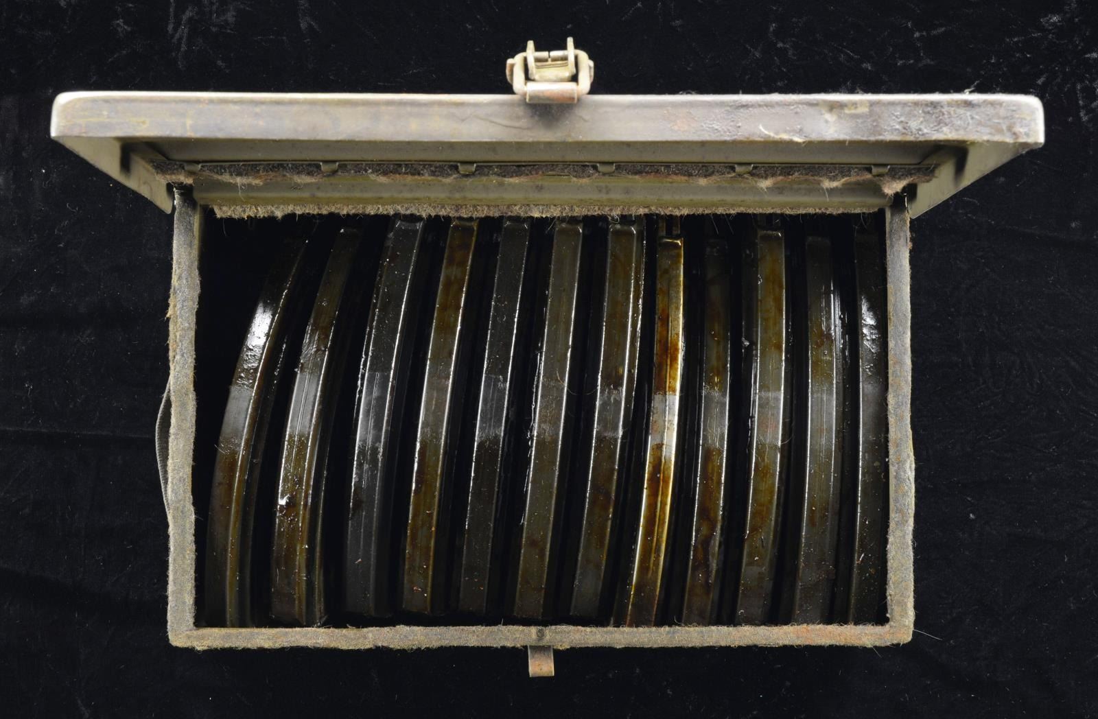 16" x 10" x 6" metal carrying box for 12 mags. CONDITION: good overall exterior finish w/ moderate handling marks & oxidation. Mags appear in good condition w/ coating of grease. (02-16288/MD). $200-350.