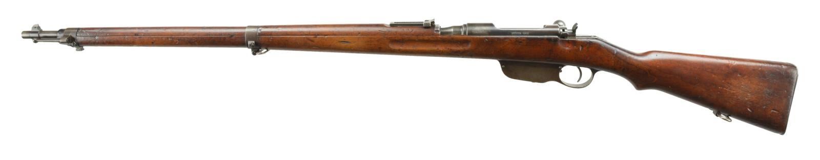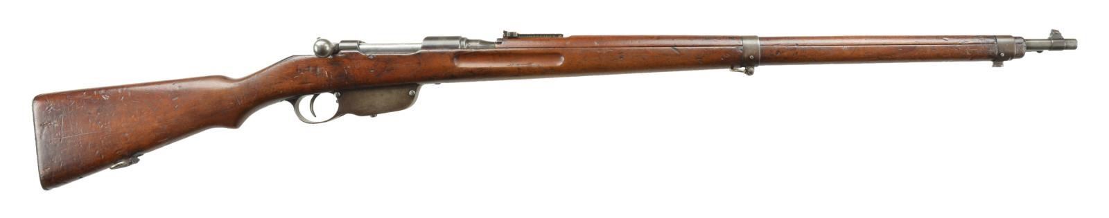 PULL RIFLE. Cal. 8x56R. S# 7477E (1903). Bbl. 30.5" w/ band mounted blade front sight & 2600 shritt ladder rear sight. "S" stamp on bbl. shank indicates conversion to 8x56R. Bulgarian crest on receiver ring & on matching numbered walnut stock set. Stock has stacking bar, bayonet lug, & bottom sling swivels. Underside of grip is stamped "H / x / W". CONDITION: good overall as arsenal refinished w/ moderate handling marks. Faded metal finish w/ in the white buttplate having peppery oxidation. Good stock varnish w/ deep gouges. Good bore w/ worn lands. (22-635/MD). CURIO. $300-500.