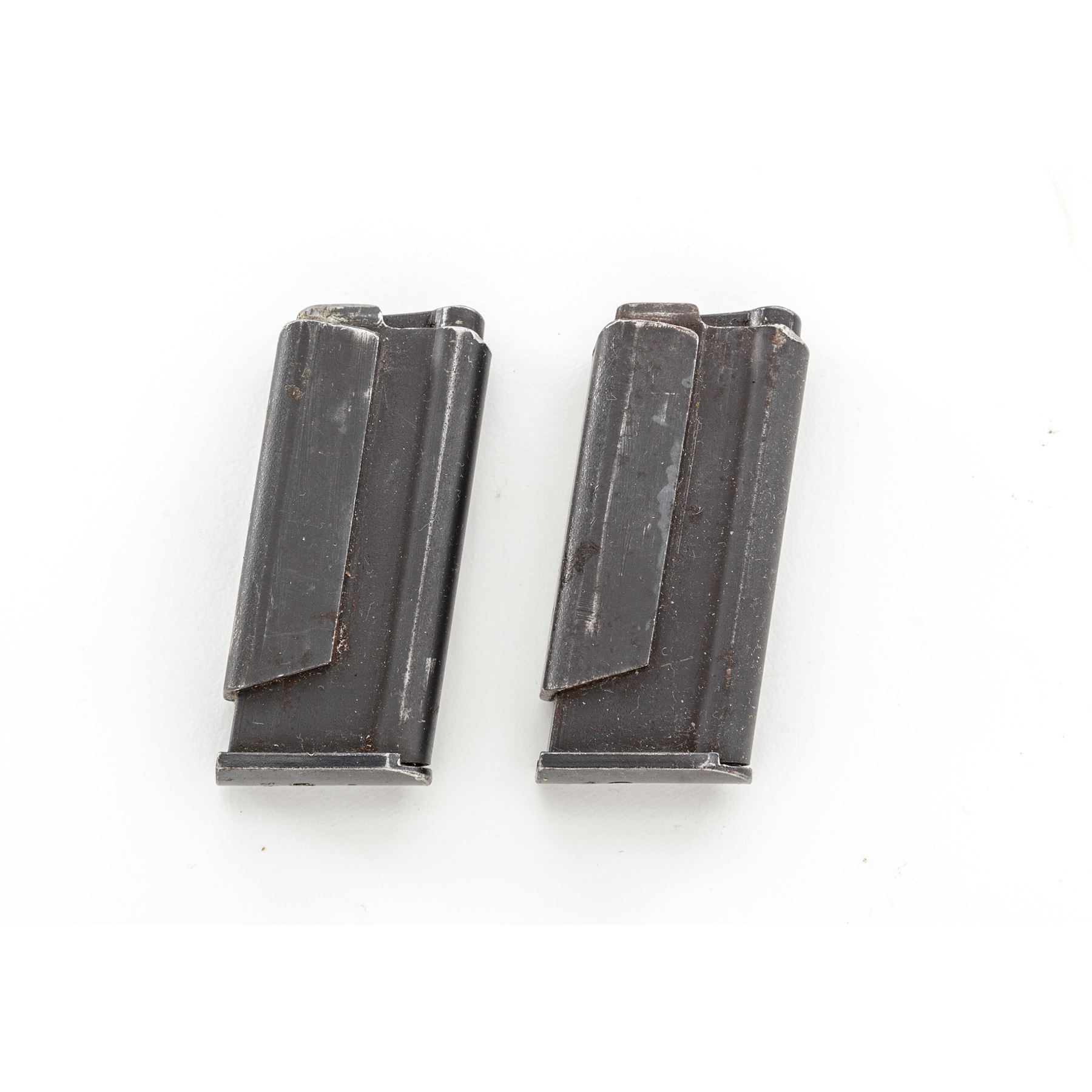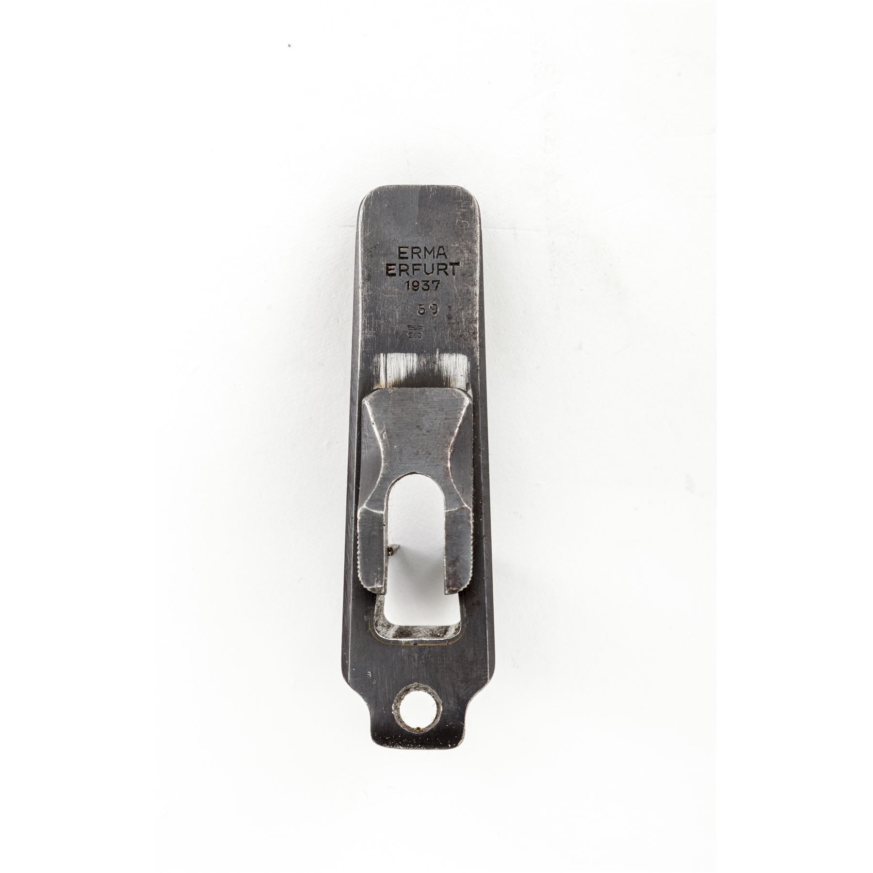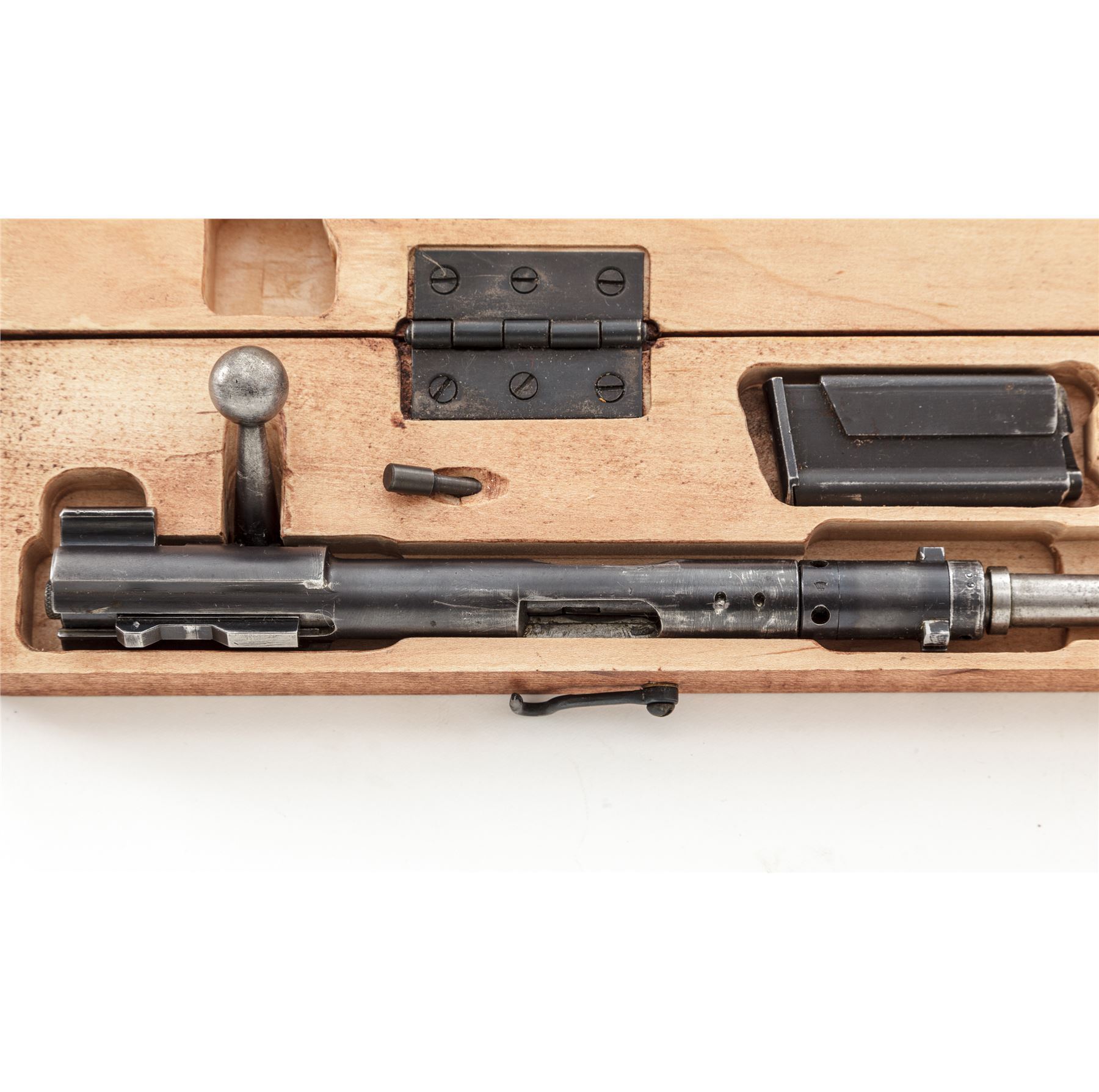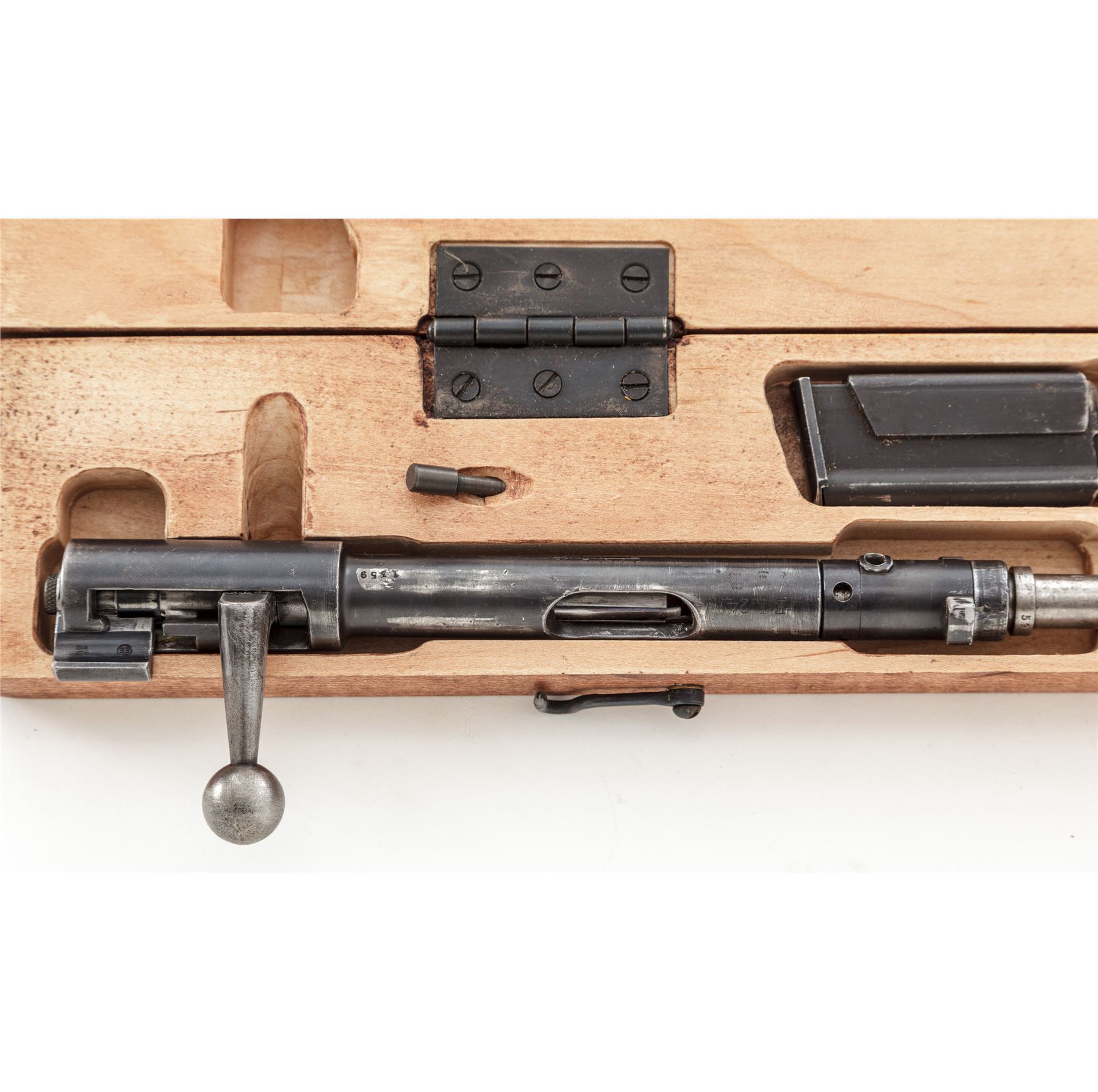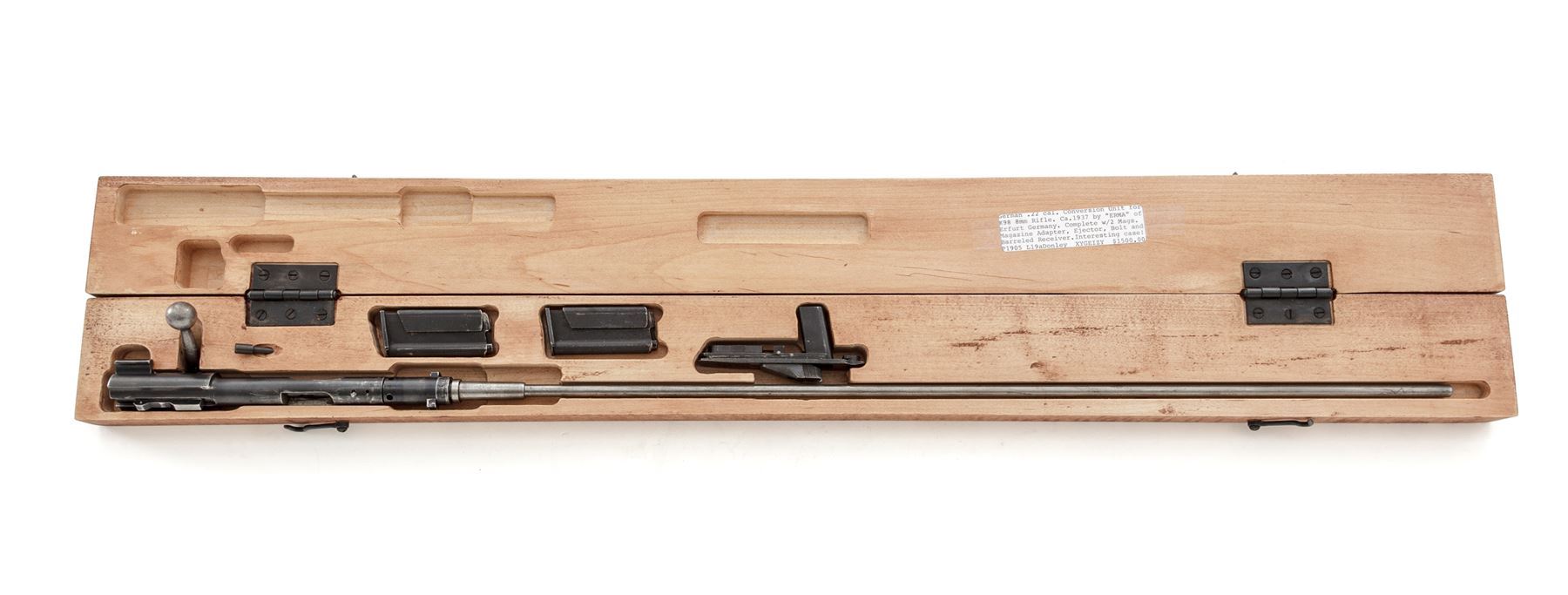WWII Era German .22 Conversion Kit for Mauser 98K Rifle, by Erma, #1359a, in contemporary transport box, with magazine floorplate adapter marked ''Erma/Erfurt/1937'', with the last two digits of the serial number (59), as well as ''(stick eagle)20'' ampt. Includes two (2) factory magazines and pin punch, all in later-mfg'd transport box. Matching numbered bolt, with all other parts marked 59, except magazines which are unmarked. Left side of bolt carrier is marked ''1/N.5.10'', but has been lined out, with chamber area marked ''EL24'', which may be club or rack markings. Condition is about fine, retaining approx. 90% lightly thinning blue overall. Magazine floorplate adapter with light general wear, predominantly in actioning areas of magazine release. Action is good, bore is bright. New-made case is excellent. Est.: $800-$1,200.