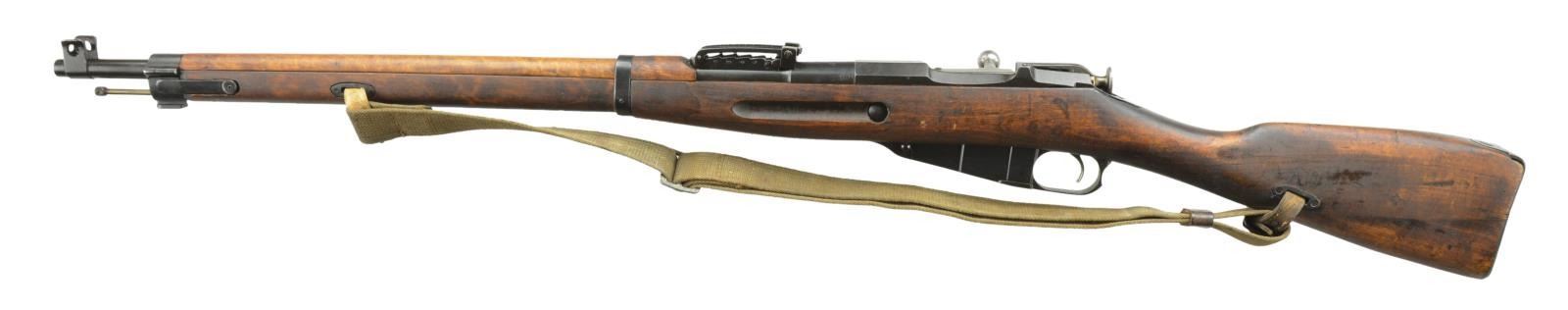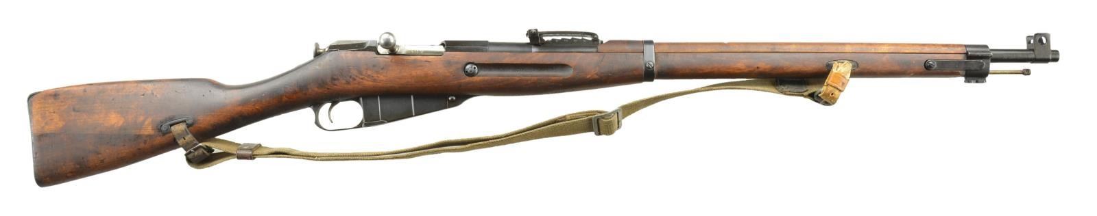 RIFLE. Cal. 7.62x53R. S# 67798. CAI import marked 27" bbl. w/ protected blade front sight & 3,000m ladder rear sight. Left side of bbl. shank has "SA" acceptance proof. Rifle reuses Russian parts including receiver marked w/ 3 dots on right side, Tula bolt (matching numbered applied), Tula mag. body, Tula buttplate w/ previous number crossed out & cleaning rod. Two piece birch stock set w/ later style reinforced hinged front bbl. band & sling slots holding a khaki web sling w/ leather "dog collars". CONDITION: very good overall as refinished. Receiver, buttplate & mag. body refinished over prior pitting w/ moderate handling marks. Wood sanded & refinished w/ moderate handling marks & lg. cracks along finger joint seam. Fair bore w/ worn rifling. (22-715/MD). CURIO. $300-400.