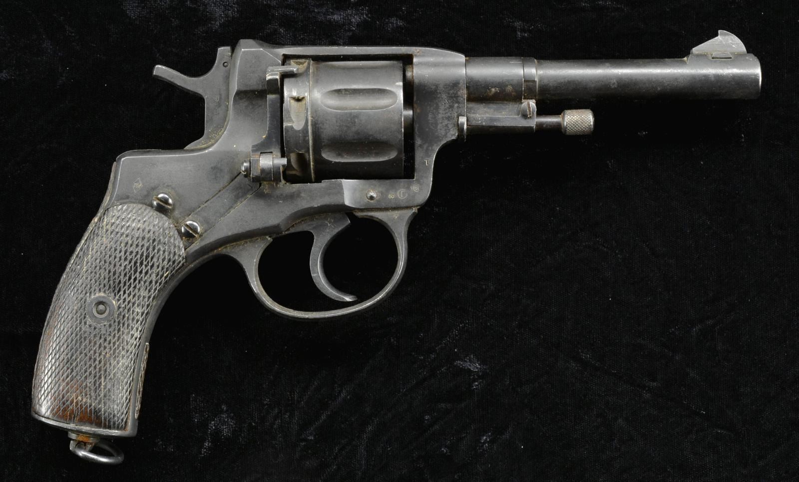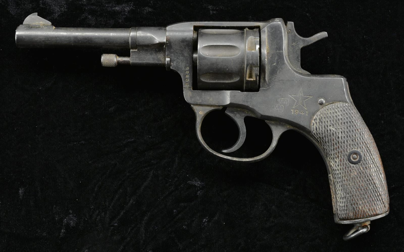 ARSENAL 1895 NAGANT DA REVOLVER. Cal. 7.62 Nagant. Russian translated S# LS965. Standard configuration w/ 4 1/2" bbl., no import marks & 2 Finnish "SA" proofs on left side by side plate marking. CONDITION: Good black arsenal refinish w/ marks. Good wood grips w/ marks & gouges. Good bore. (22-2041/MD). CURIO. $300-450.