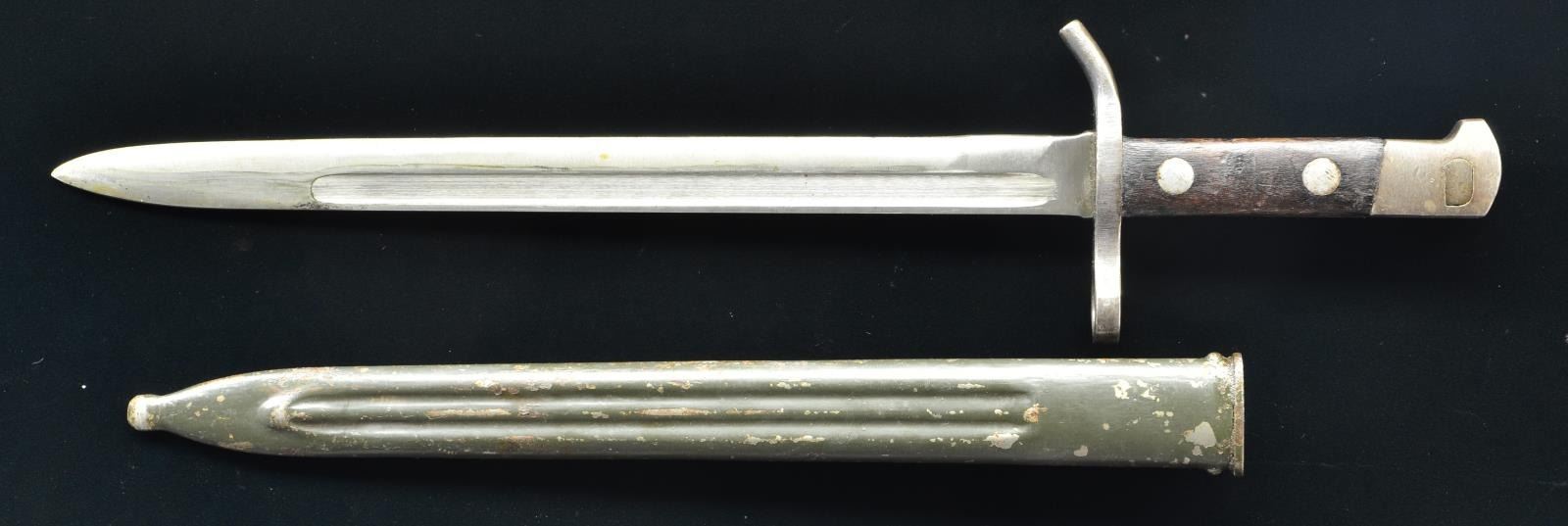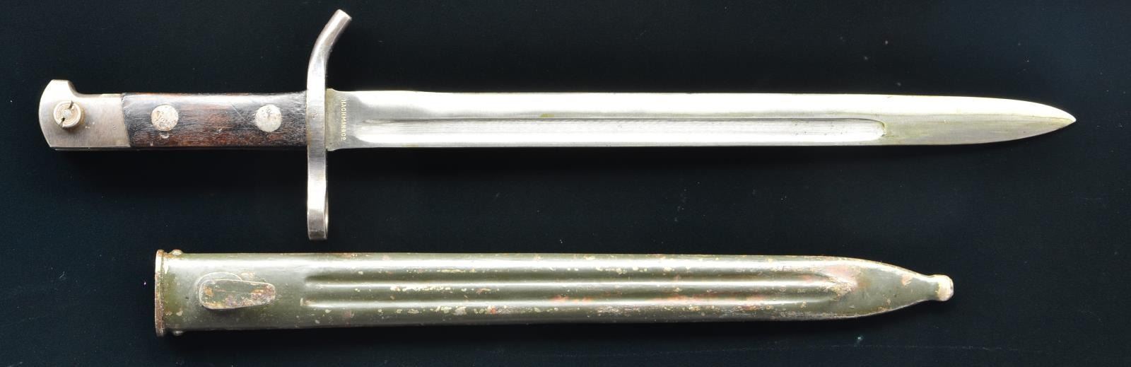 Mfg. by Hackman & Co. Assigned to rifle ending in "73" w/ 2 previous other numbers crossed out. 16.25" Overall. Blade 11.75". Good to very good overall condition. (02-16319-1/MD). $50-100.