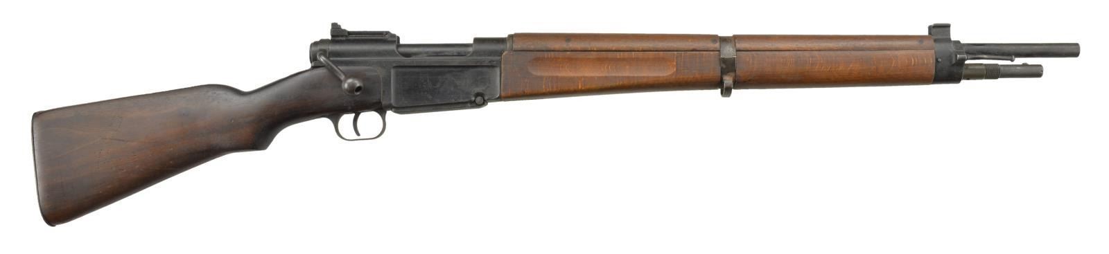 Cal. 7.5 French. S# G3695. Bbl. 22.5". Front band has stacking bar, spike bayonet & protected blade front sight. Pre WWII action w/ 1200m aperture tangent rear sight. Matching numbered mag. plate & trigger guard. Walnut stock set w/ left side sling bars & punch dot "7" on right side of buttstock. CONDITION: fair overall arsenal refinished metal w/ oxidation & pitting. Good wood finish w/ chips & gouges. Very good bore. (22-1946/MD). CURIO. $300-500.
