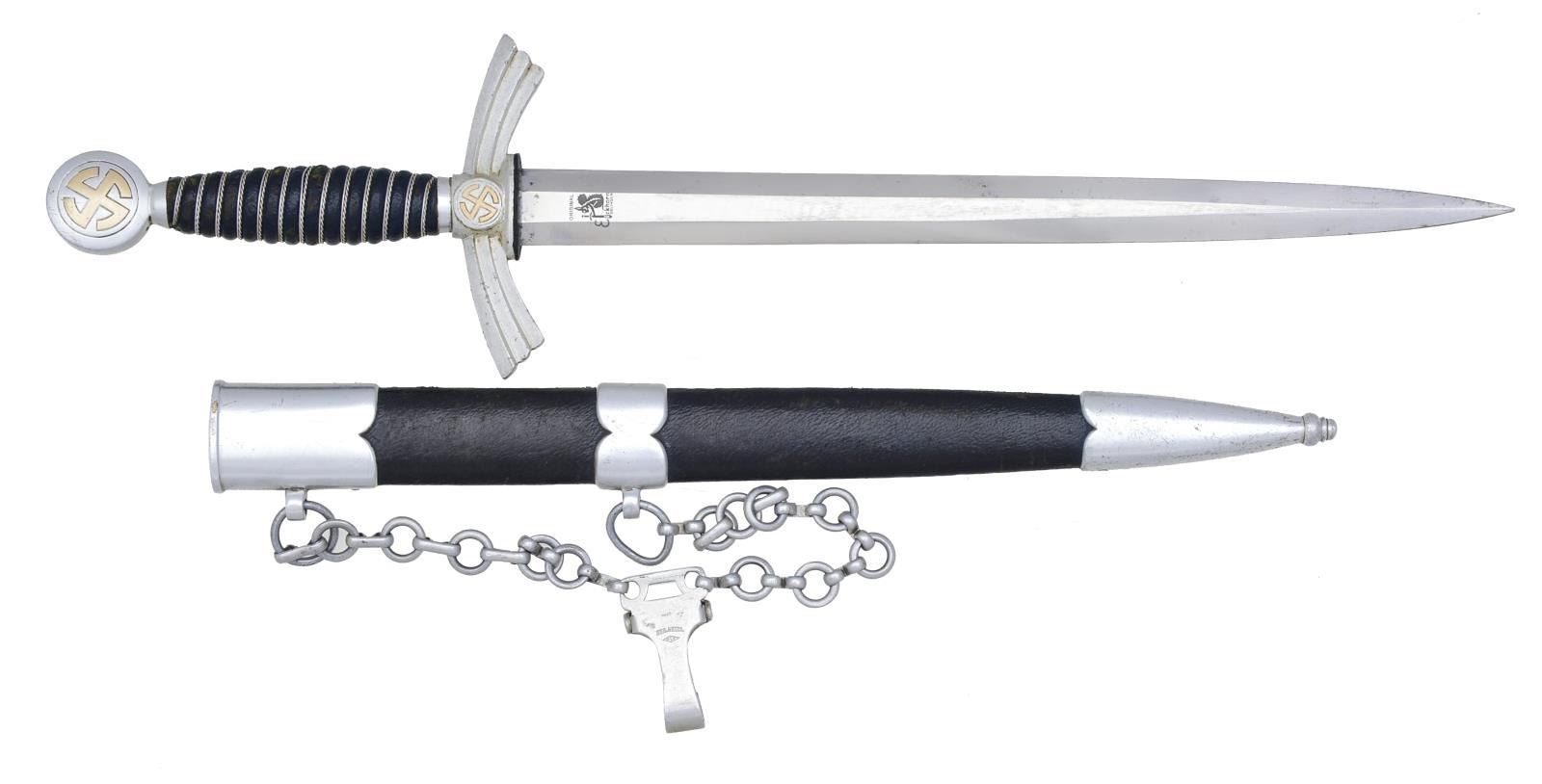 Overall length: 19 1/4". Blade marked, “ORIGINAL (squirrel) EICKHORN SOLINGEN”. Aluminum crossguard & pommel w/ gold plated Party symbols. Dual wire wrap on blue leather covered grip. Aluminum mounted scabbard w/ blue leather body. Original aluminum hanger. CONDITION: blade shows areas of original polish. Mounts & grip show light wear. Scabbard has a few scuffs & scrapes to the leather. (02-14618/BF). $500-750.