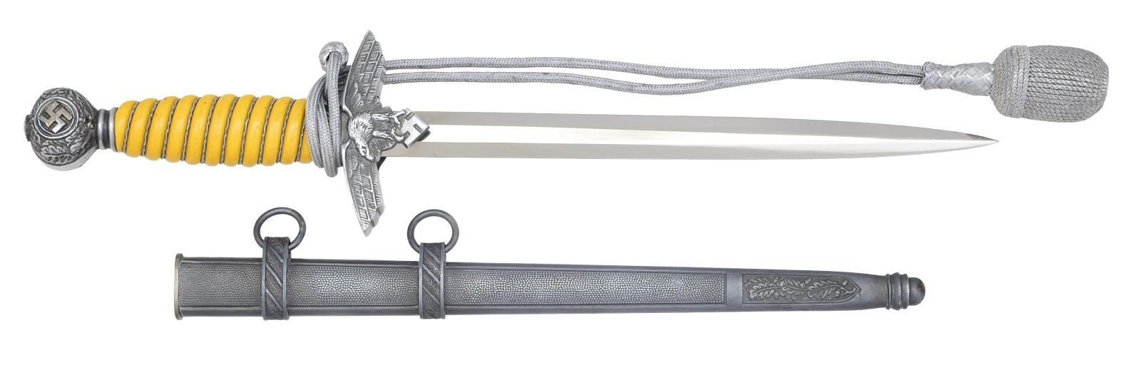 Overall length: 16 7/8". Blade marked, “PAUL WEYERSBERG & CO SOLINGEN(sword & wreath)”. There is a waffenamt stamped above the maker’s mark. Aluminum Luftwaffe eagle crossguard & pommel. Aluminum, wire wrapped, cream colored composite grip w/ knot attached. Plated scabbard. CONDITION: blade shows areas of original factory polish. Mounts & grip show very light wear. Scabbard has tarnished to a light gray. (02-14619/BF). $500-700.
