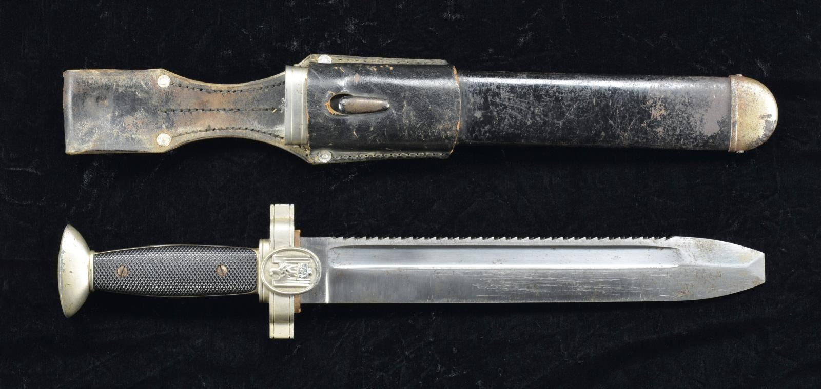 Overall length: 16 1/4". Single fullered blade w/ sawback spine marked "GES / GESCHUTZT". Plated pommel & crossguard having party eagle & symbol. 2 Piece black composite grips w/ the front grip checkered. Black painted scabbard w/ plated mounts. Black leather frog. CONDITION: blade w/ moderate marks on edge, patina & oxidation. Very good grips w/ oxidized screws. Good plating w/ edge wear. Good scabbard retaining finish w/ moderate marks, flaking & oxidation. Fir frog intact w/ moderate marks, mildew & flexing. (02-16187/MD). $400-600.