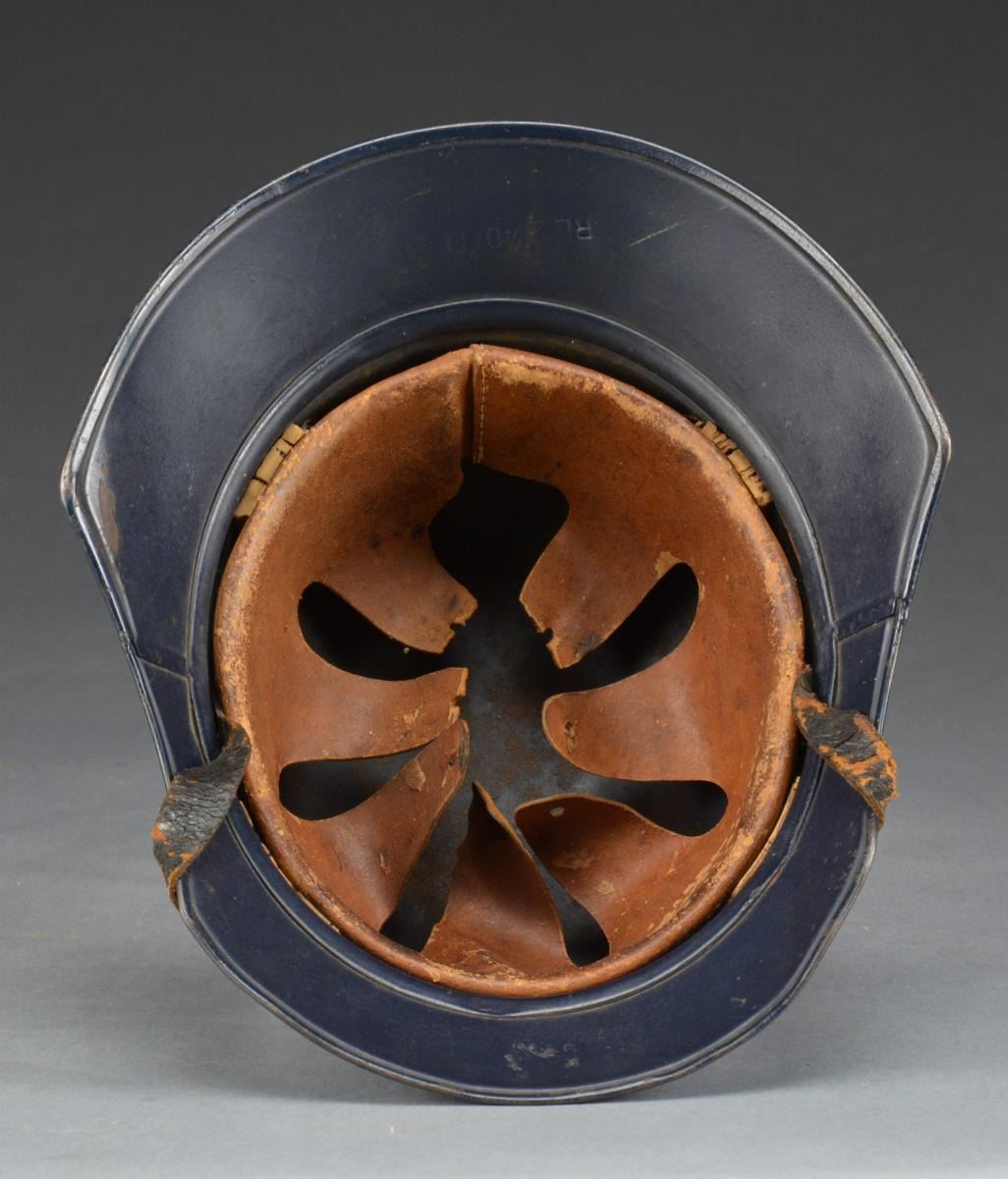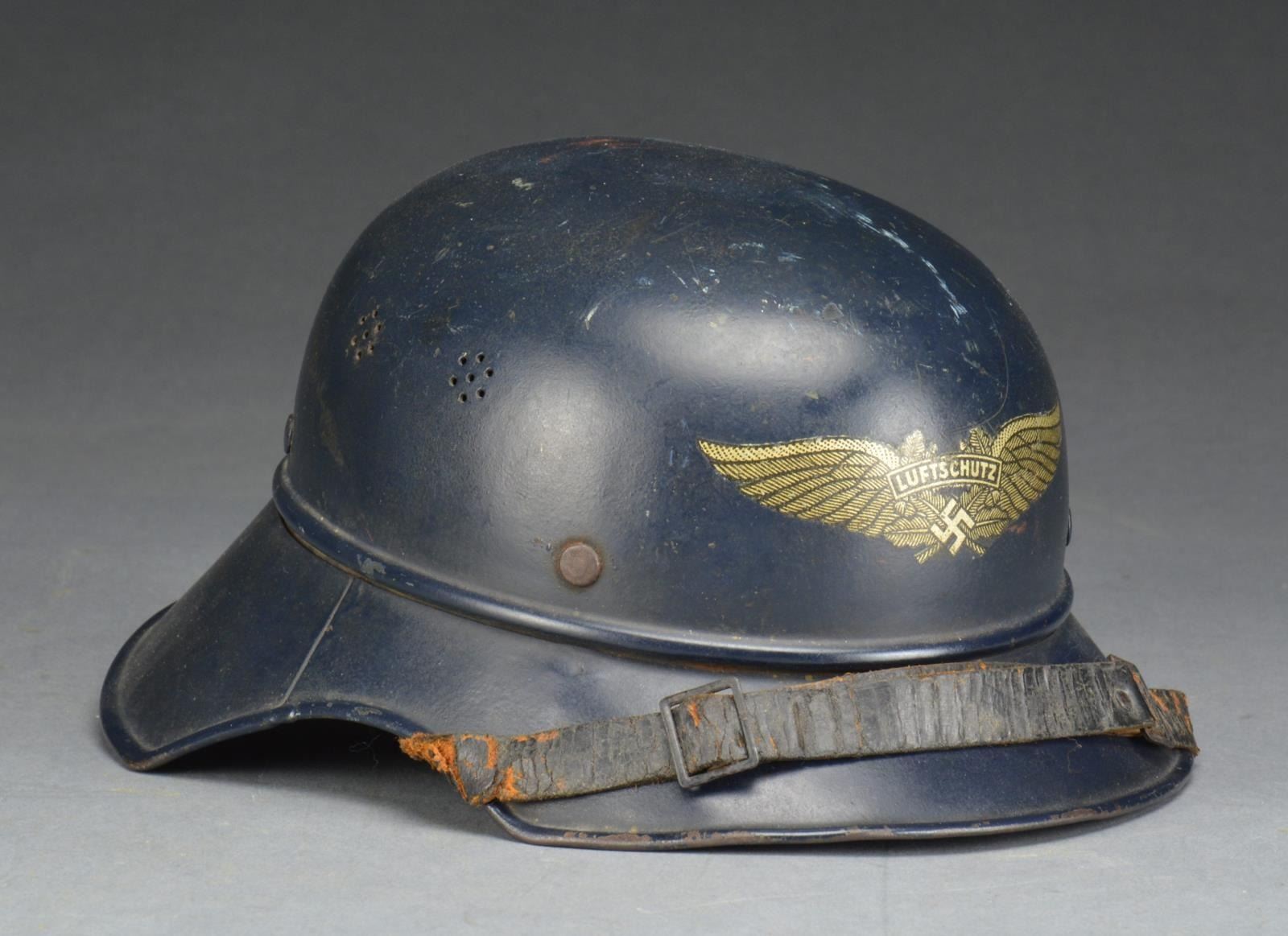 A nice example of a dark blue painted gladiator style Luftschutze helmet w/ a pair of 7 hole vents on each side & a full Luftschutze decal in the front. Black leather chinstrap & brown leather 7 tongue liner. Rear of helmet is stamped “RL 2 40/14”. CONDITION: helmet shows a few scattered scuffs & scrapes. Decal is 98%. Chinstrap is cracked & crazed but unbroken. Liner has losses at the top of 3 tongues. (02-13762/BF). $200-350.