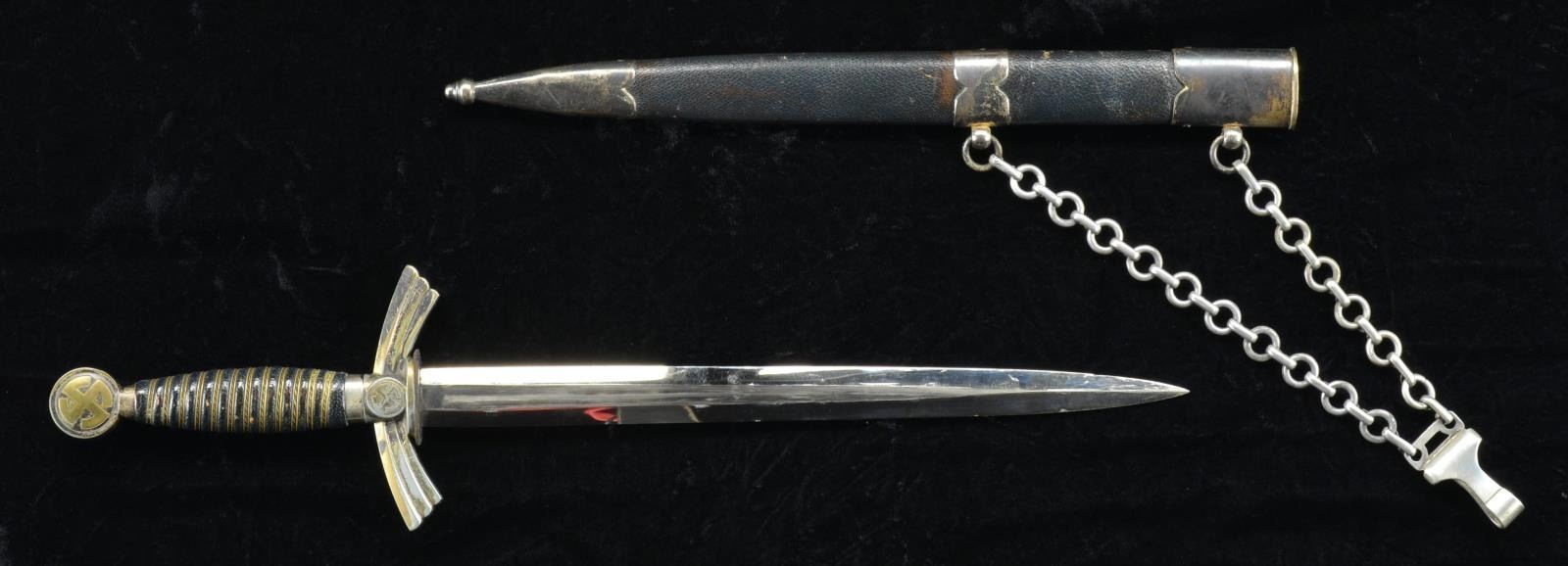 DAGGER. Overall length: 19 1/2". Ricasso is marked “P.D. LUNESCHLOSS SOLINGEN”. Alloy crossguard & pommel w/ bronze colored party symbol in center. Wire wrapped blue leather grip. Plated mounts on blue leather scabbard. Alloy hanger attached. CONDITION: Blade has very good appearance w/ scabbard wear. Plated alloy metal has patina appearance w/ wear & oxidation. Good grip appears intact w/ flaking finish. Very good hangar w/ light patina. Leather on scabbard detaching near throat on one side; balance appears good w/ wear & flaking. (02-16188/BF). $350-550.