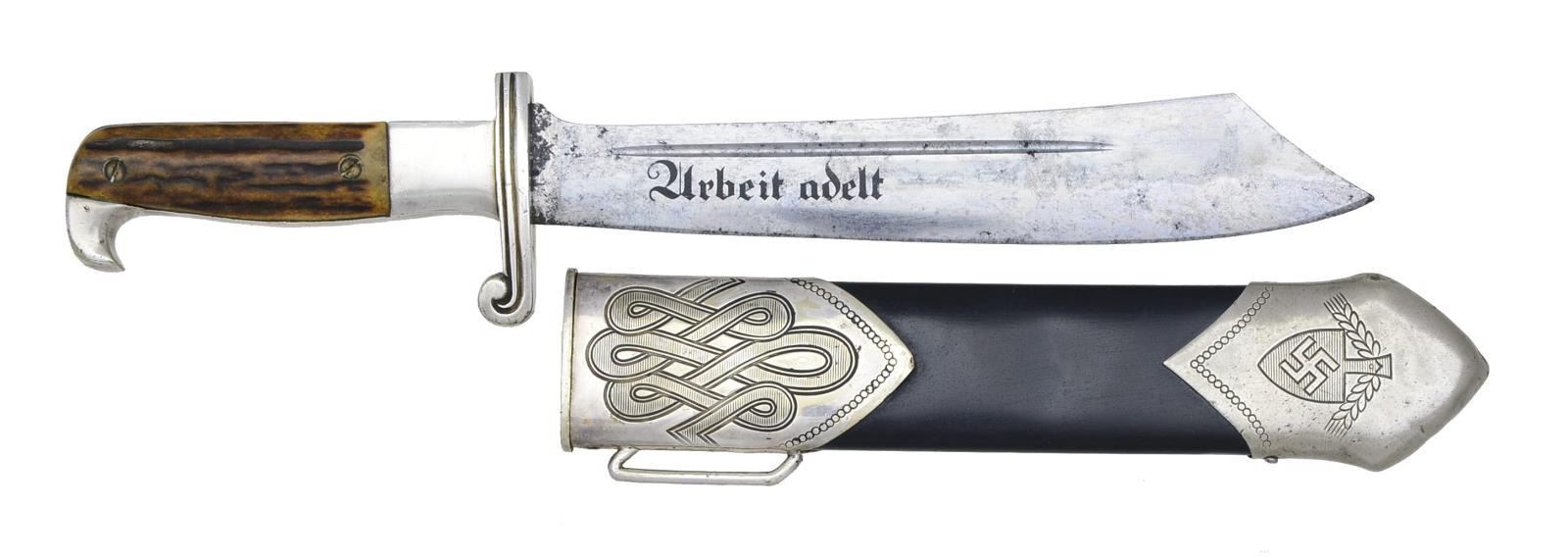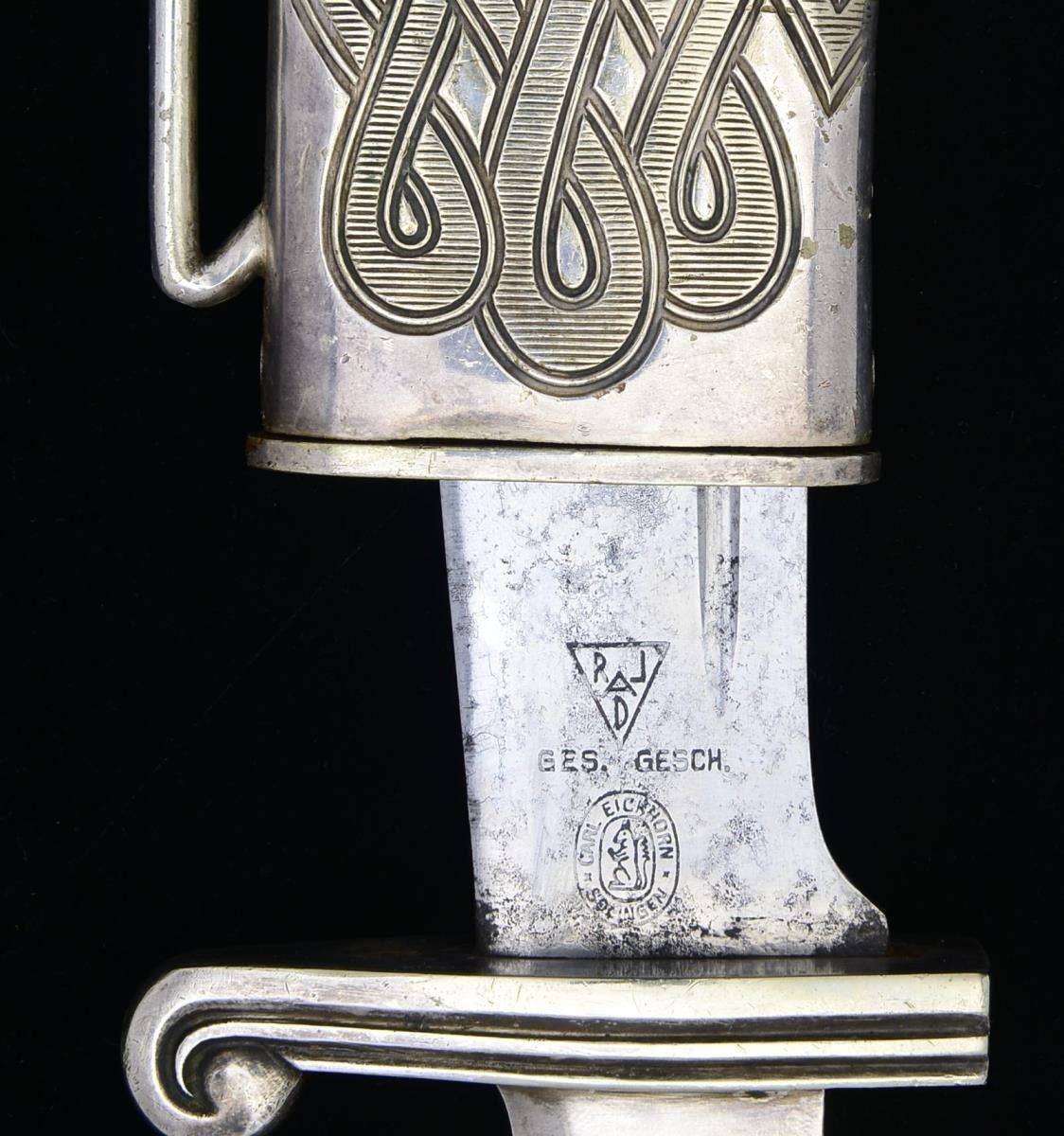 Overall length: 15 5/8". Blade is etched, “Arbeit adelt” on the front & is stamped on the reverse, “RLAD(in triangle) GES. GESCH. CARL EICKHORN *SOLINGEN* (squirrel)”. Nickel silver hilt w/ 2 piece stag horn grips. Nickel silver mounted scabbard w/ black painted body. CONDITION: blade has a gray finish w/ areas of cleaned oxidation & minor pitting near the hilt. Hilt shows light to moderate wear. Scabbard was likely repainted during its useful life. There is a dent in the body of the scabbard. Mounts shows moderate wear. 2 Attachment screws are missing & 1 is replaced. (02-14626/BF). $400-600.