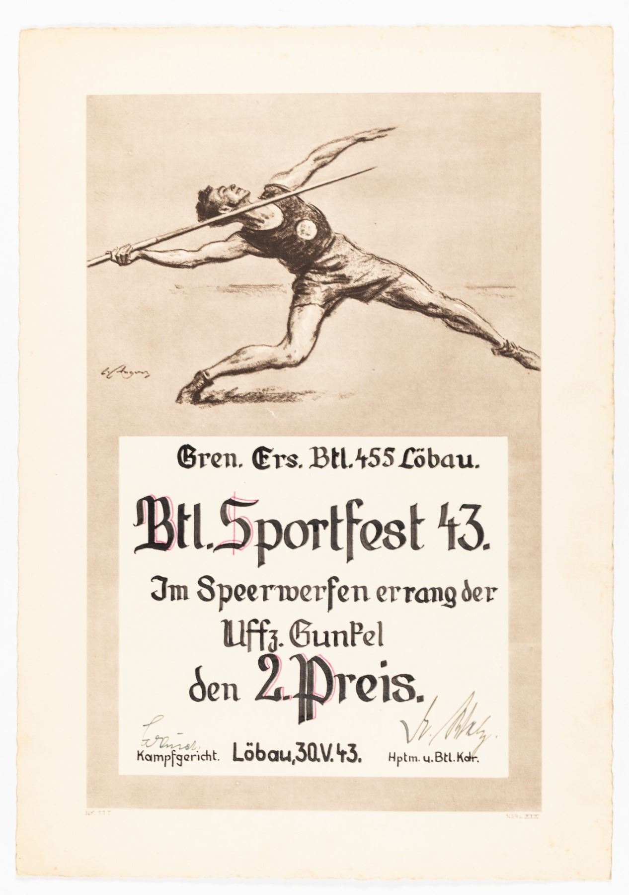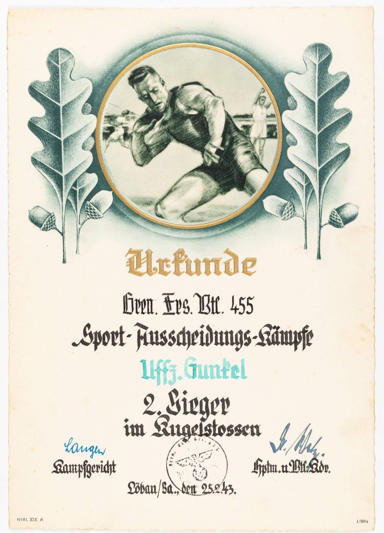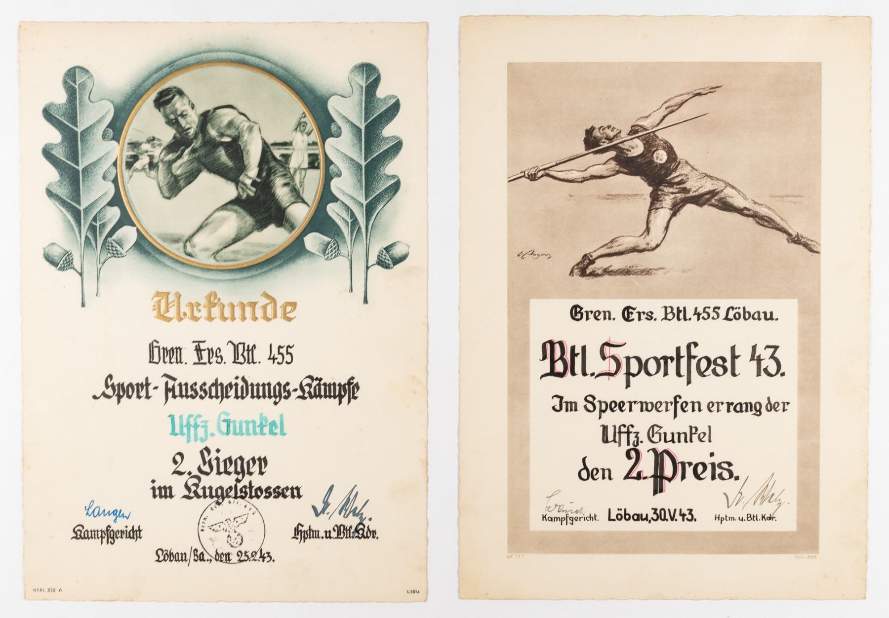 Two German WWII athletic awards (Urkunden) for a Wehrmacht soldier who participated in sport tournaments in 1943 in Lobau, organized by the NSRL, the Sports Office of the Third Reich. Both awards are issued to Unteroffizier Gunkel of the Grenadier Ersatz Btl. 455 Lobau Unteroffizier Gunkel for second places in javelin throw and shot-put competition. 12 x 8 inches each. Two pieces.