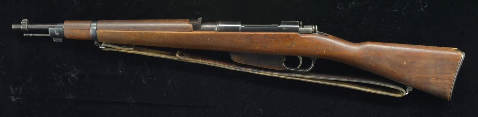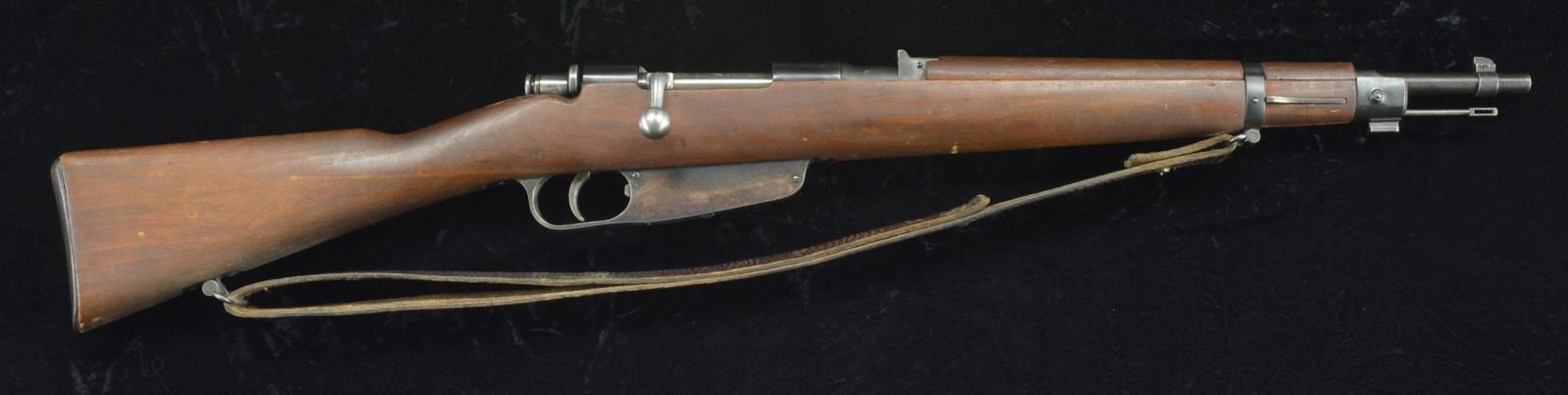 ACTION RIFLE. Cal. 6.5x52mm (6.5 Carc.). S# RA70006. Bbl. 17.76" w/ blade front sight & fixed rear sight. Bbl. shank has partially obscured "43" date. Blue finish. Matching numbered hardwood stock set w/ cleaning rod & sling. CONDITION: Good overall w/ moderate handling marks. Mag. has brown patina on all sides near both section. Stock has deep gouges & chips. Very good bore. (22-542/MD). CURIO. $300-500.