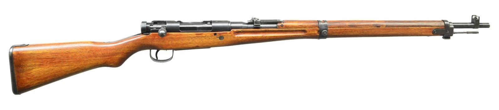RIFLE. Cal. 7.7 Jap. S# 18917. Bbl. 25 1/2" w/ protected blade front sight & 1500m rear sight having provision for anti-aircraft wings. Receiver appears to have Series 20 stamp w/ mum on receiver ring partially obliterated. Hardwood stock set of 2 piece construction w/ cleaning rod & metal buttplate. CONDITION; good plus overall appearance w/ wear & handling marks. Stock appears to have been duffel cut, then repaired. Good bore. (22-2847/MD). CURIO. $400-600.