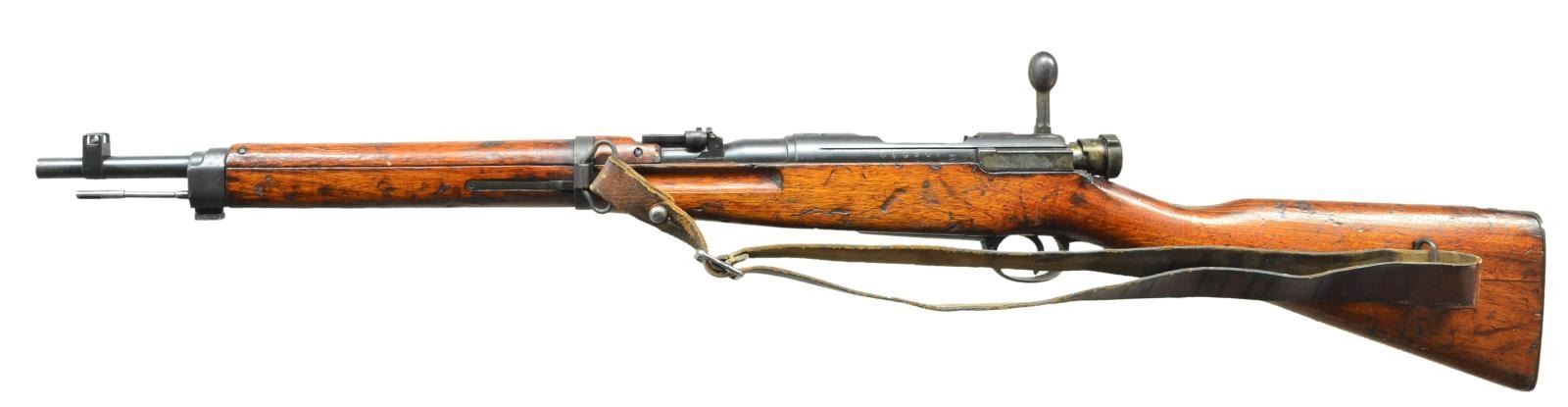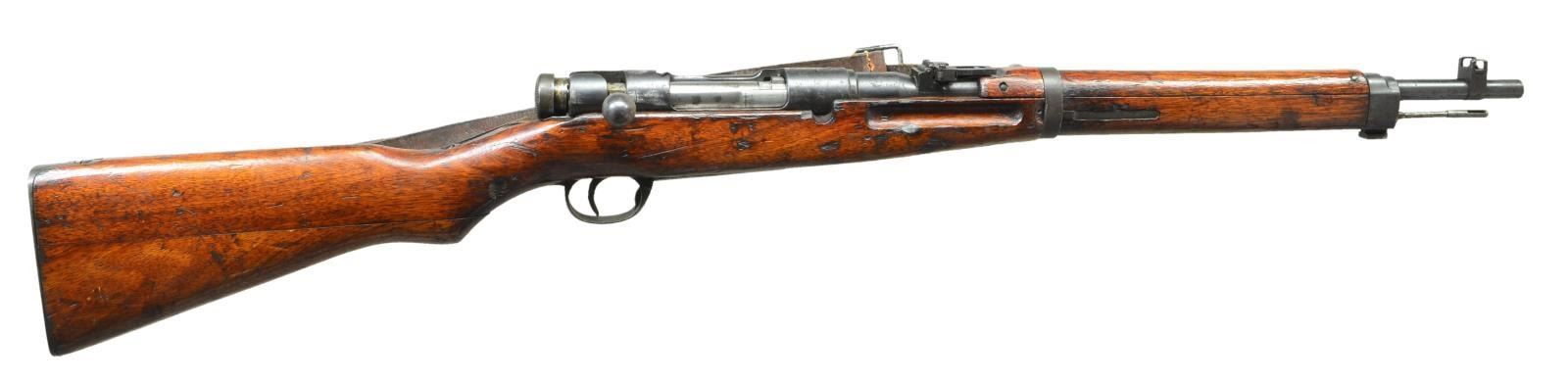 Cal. 6.5 Jap. S# 615901. Bbl. 19" w/ protected blade front sight & 2,000m ladder rear sight. Receiver has crossed out mum, Type 38 markings. Bolt assembly has dust cover. Hardwood stock set of 2 piece construction w/ metal buttplate & brown leathers sling. CONDITION: Good metal finish w/ oxidation & pitting. Good stock finish w/ moderate marks, gouges & oval shaped repair at toeline. Fair tatered sling. Good shiny bore. PROVENANCE: Estate Collection of Jack Verret Sr. (22-789/MD). CURIO. $200-400.