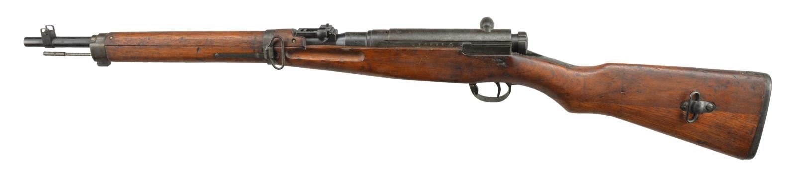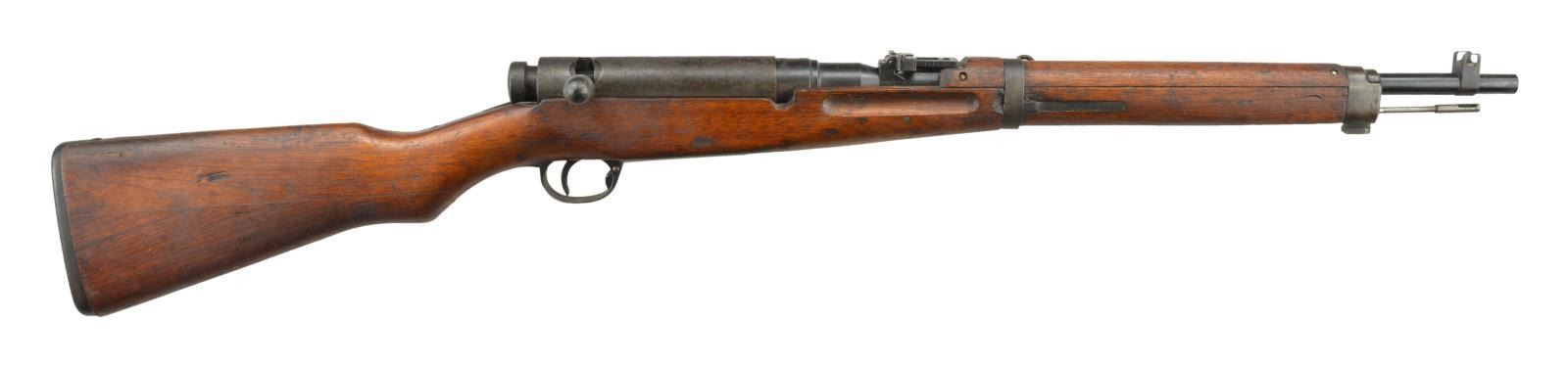 CARBINE. Cal. 6.5 Jap. S# 16993. Bbl. 19" W/ protected blade front sight & 2,000m ladder rear sight. Receiver ring has grounded off mum. Left side receiver has Series 5 appearing & Nagoya Arsenal stamp. Matching numbered bolt w/ dust cover. Hardwood stock set of 2 piece construction w/ cleaning rod, side sling swivels & metal buttplate. CONDITION: fair metal finish overall w/ oxidation, pitting & marks. Fair stock finish w/ gouges, marks & inlet wood repair around peak of buttplate. Very good bore. (22-1933/MD). CURIO. 250-400.