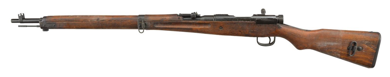 RIFLE. Cal. 7.7 Jap. S# 10856. Bbl. 26" w/ protective blade front sight & 1500m ladder rear sight. Receiver ring has mum w/ "X" stamp through. Left receiver has Series 7 appearing stamp along w/ Nagoya mark. "Last Ditch" style matching numbered bolt w/ grooved safety button. Hardwood stock set of 2 piece construction w/ sm. recoil bolt, cleaning rod, & metal buttplate. CONDITION: Good black painted finish w/ oxidation & marks. Fair coarse wood grain & finish w/ mildew staining, shallow gouges & marks. Good shiny bore. (22-1953/MD). CURIO. $250-400.
