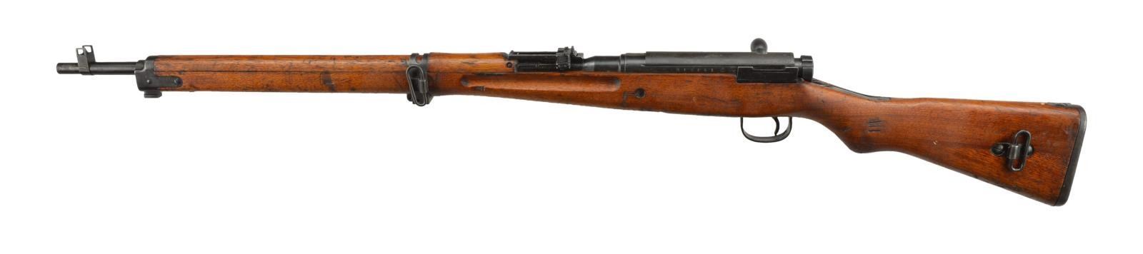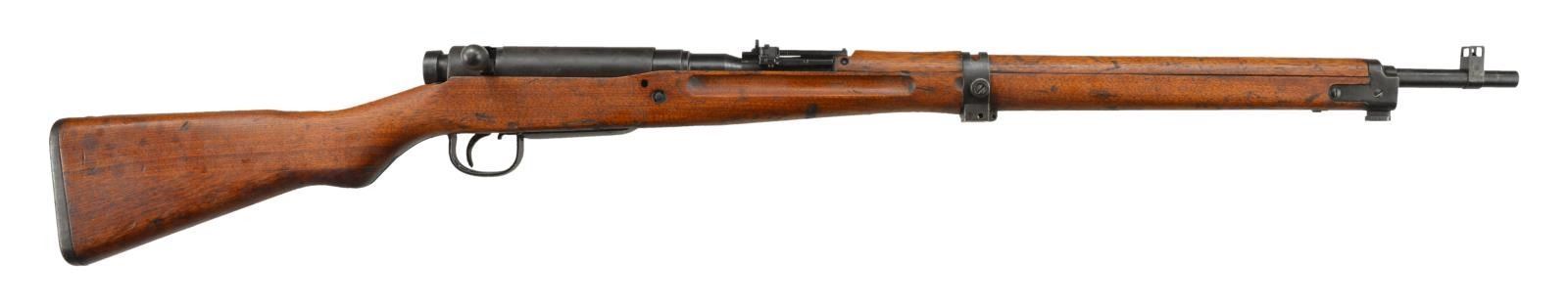 RIFLE. Cal. 7.7 Jap. S# 16451. Bbl. 26" w/ protective blade front sight & 1500m ladder rear sight having anti-aircraft wings. Receiver ring has grounded off mum. Left receiver has Series3 1 appearing stamp along w/ Tokyo Kogyo mark. Matching numbered bolt sleeve w/ dust cover. Hardwood stock set of 2 piece construction w/ sm. recoil bolt, provision for cleaning rod, mid band having provision for mono pod & metal buttplate. CONDITION: good plus metal finish w/ oxidation & faded finish; more notable on bottom metal, dust cover & buttplate. Good stock finish w/ gouges & sm. cracks. Good shiny bore. (22-1951/MD). CURIO. $300-500.